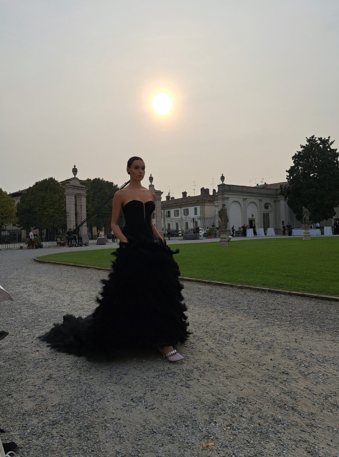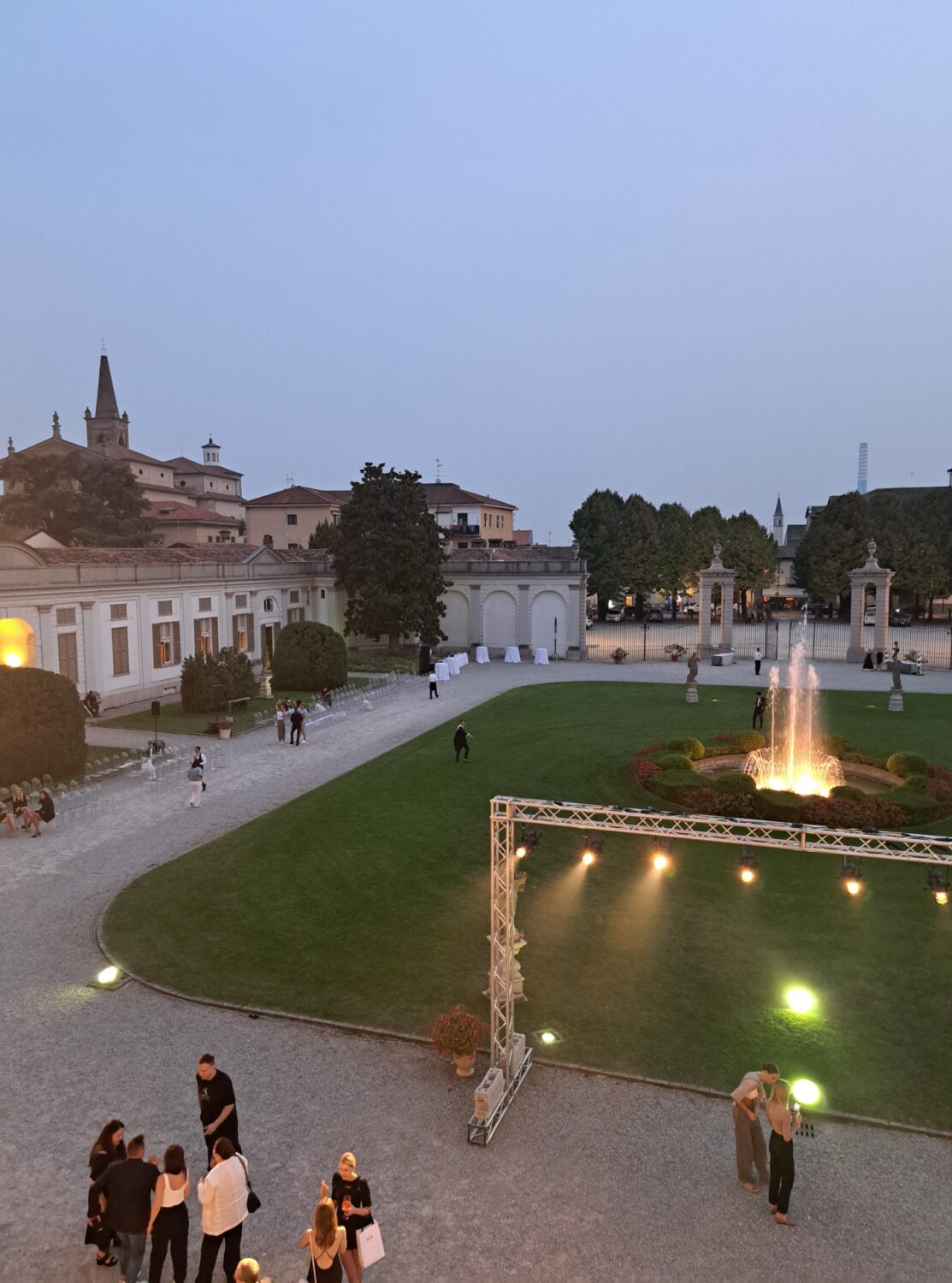 L’hotel in cui veniamo ospitati è il Castello Visconteo, fortezza del 1200 sul fiume Adda. I muri, abbelliti da arazzi e affreschi, trasudano storia anche se le stanze sono in realtà moderne e confortevoli. Enormi saloni con grandi camini, ampie finestre che affacciano sulla corte interna, sulla piazza e sul fiume fanno intravedere scorci della città. Dopo un veloce passaggio in stanza la location dell’evento si raggiunge tranquillamente a piedi, ottima occasione per scoprire una cittadina curatissima, con poco traffico dove è piacevole passeggiare in queste calde giornate d’autunno. Arrivati a Villa Borromeo rimaniamo incantati dal palazzo che si staglia davanti ai nostri occhi in tutto il suo splendore, con la sua facciata imponente ed il suo immenso giardino. L’attenzione viene attirata dalle addette all’accoglienza che ci consegnano il materiale dell’evento e ci accompagnano verso i nostri posti. Si perché sarà la sfilata collettiva, con una selezione di capi degli atelier partecipanti, ad aprire questi due giorni di eventi dandoci una panoramica sulla manifestazione.