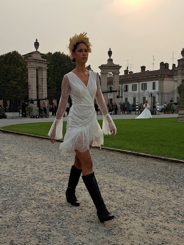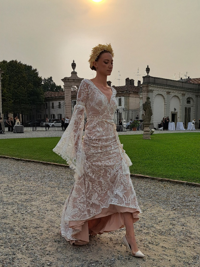 Abiti principeschi, magistralmente tagliati e cuciti, lavorazioni e tessuti d’alta moda, pizzi, duchesse, chiffon e georgette linee classiche e moderne come le audaci tute in pizzo, i crop-top e le sovra gonne che rendono i capi trasformabili per adeguarsi alle esigenze della sposa e alla voglia di divertirsi con parenti ed amici dopo la cerimonia. Abiti scintillanti, impalpabili tulle che lasciano trasparire la silhouette femminile, si contrappongono al mini abito in pizzo con gli stivaloni a coscia abbinati o al più strutturato abito in cadì.