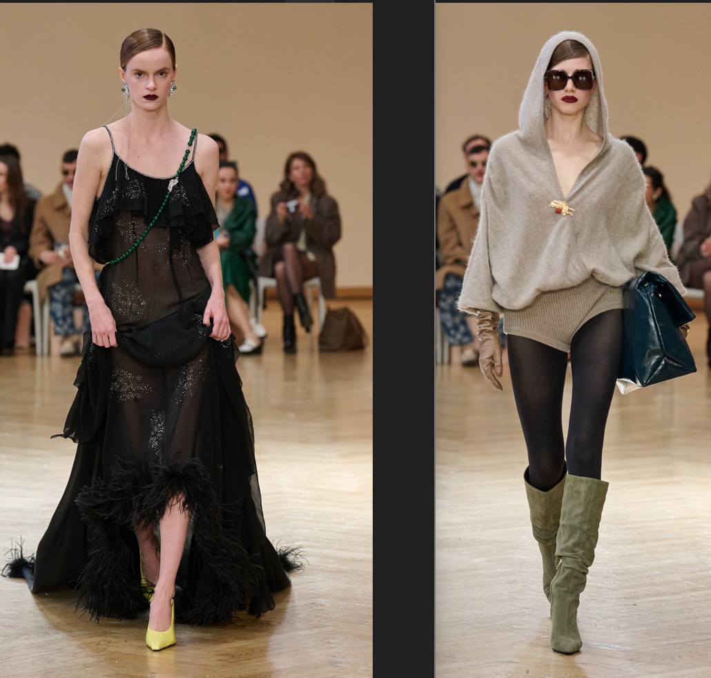 La purezza del ghiaccio, evocata dalla brina sui rami, si riflette in tessuti trasparenti e impalpabili, capaci di catturare la luce e creare un effetto etereo aggiungendo profondità e movimento. Ricami minuziosi ed effetti traslucidi amplificano questo gioco di riflessi, dando vita a un’estetica sospesa tra sogno e realtà.