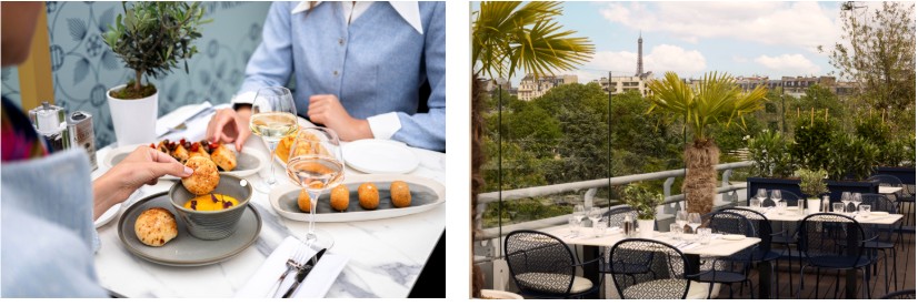 Con una vista mozzafiato della capitale, il tetto, il suo ristorante e il suo solarium invitano la clientela ogni giorno per un interludio gastronomico all’aperto per celebrare l’estate a Parigi in uno spirito leggero, vivace e gioioso.