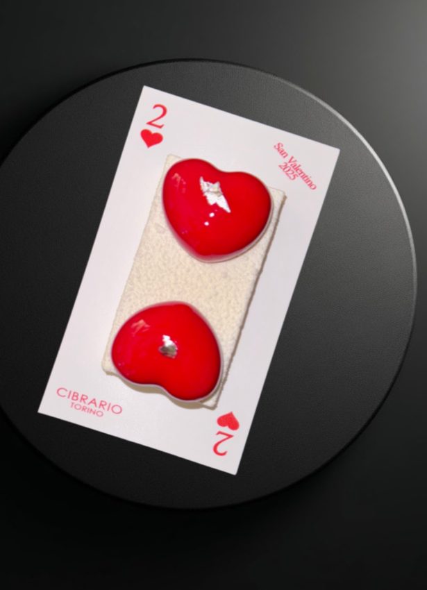 Nella sua Bakery Cibrario Torino, Jacopo Pistone firma “Due di Cuori”, una monoporzione in Limited Edition che celebra l’amore in ogni dettaglio. Il dessert è pensato per essere diviso a metà e condiviso: un croccante al biscotto avvolge una mousse alla vaniglia con fava tonka, un cremoso al passion fruit e un cremoso al lampone. Un packaging elegante e un sottotorta da conservare rendono questa creazione un vero ricordo da custodire.