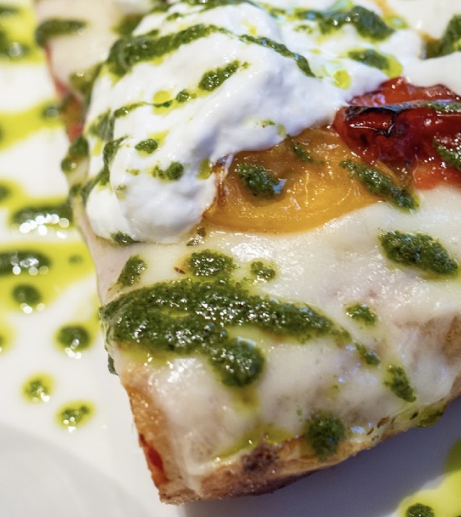 Come pizze, si parte dalla Margherita che rappresenta la tradizione, ed è eseguita con precisione. Per chi cerca un’opzione ancora più leggera, il trancio rosso con bufala aggiunta fuori forno offre freschezza e semplicità. Tra le varianti creative spiccano la crudo, gorgonzola e pesto di rucola, che unisce sapori intensi a note erbacee, e la finocchiona con salame toscano e crema di carciofi. Altre opzioni? Ecco la coreografica Giallorossa, con stracciatella, pomodorini confit gialli e rossi e pesto di basilico home made, che combina novità, cremosità e dolcezza.