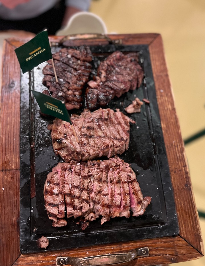 Abbiamo assaggiato una gustosa Picanha argentina, un tenero controfiletto, preceduti da primi. La carne scelta al banco arriva a tavola dopo poco, calda e già porzionata in straccetti. Il ragù bianco è molto delicato, i cavatelli si perdono un pò nei gusti accessi delle eccelse tagliate. Verdure grigliate e bombe e bombette (varie rivisitazioni delle polpette da provare) sono probabilmente la ideale scelta di accompagnamento. Sorprende il rosso della casa, un Primitivo molto adatto all’offerta gastronomica.