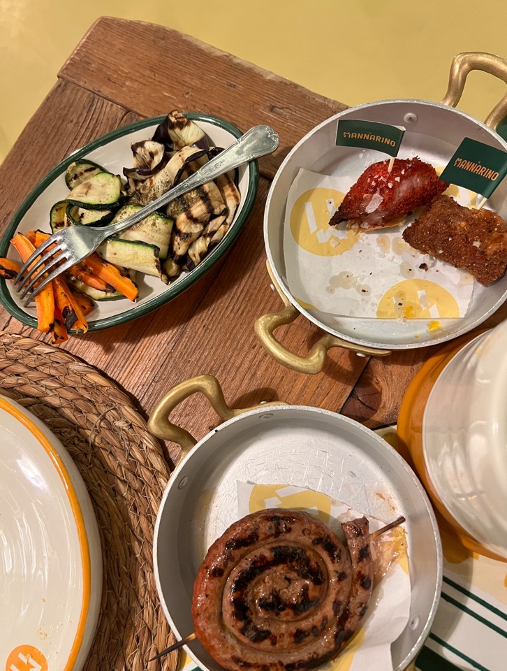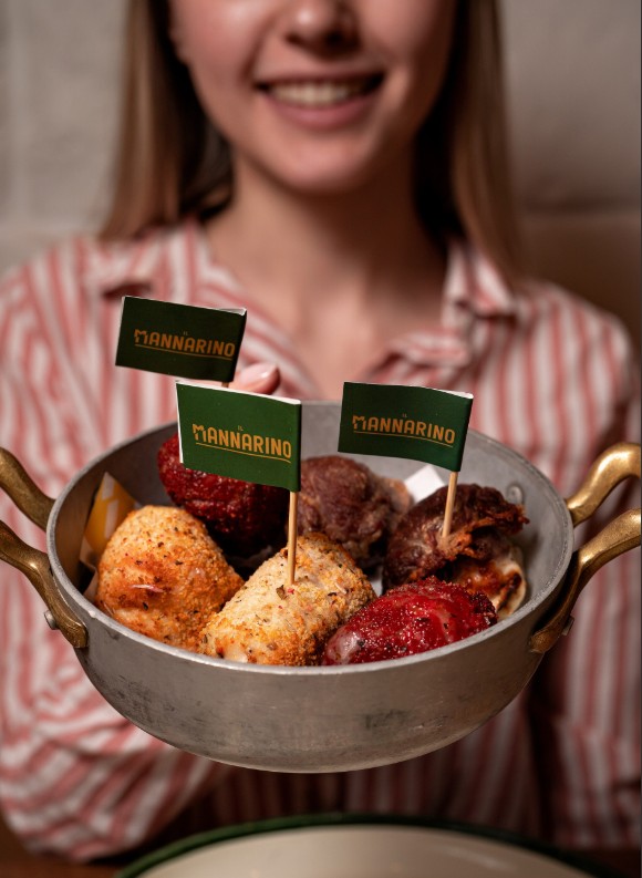 Nei locali Il Mannarino si trovano eccellenze selezionate, dai grandi classici come costate e fiorentine, T-bone e tomahawk, fino alle iconiche bombette pugliesi preparate a mano ognig iorno, gli arrosticini abruzzesi, la salsiccia Zampina pugliese e le gustose Alette di pollo piemontese panate. Immancabili le polpette della nonna, cotte tutta la notte nel sugo, e il caciocavallo filante alla griglia. Completano l’offerta contorni freschi e saporiti, come verdure grigliate, cime di rapa, caponata e patate novelle.