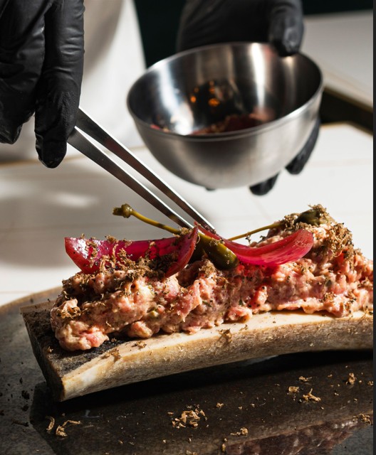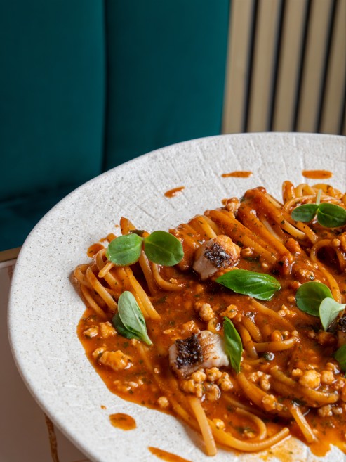 Il menù si muove tra crudi, piatti di pesce, carne e proposte vegetali, in un equilibrio che alterna riconoscibilità e sorpresa. Il mare è una presenza importante ma non esclusiva: la carta guarda alla tradizione mediterranea con una sensibilità attuale, lasciando spazio a una cucina pulita e diretta, fondata sulla qualità della materia prima. Tra le proposte che meglio rappresentano lo stile del locale, il Velo – battuta di gambero viola accompagnata da guacamole, salsa agli agrumi, burrata e crostini alla paprica – affianca la Tartare di scottona condita con fiori di cappero, cetriolini, senape, lamelle di tartufo, femore arrosto e maionese al finocchietto. Non mancano i primi di ispirazione marina, come la Linguina al ragù di scorfano con pomodorini rossi e gialli, né piatti di terra come le