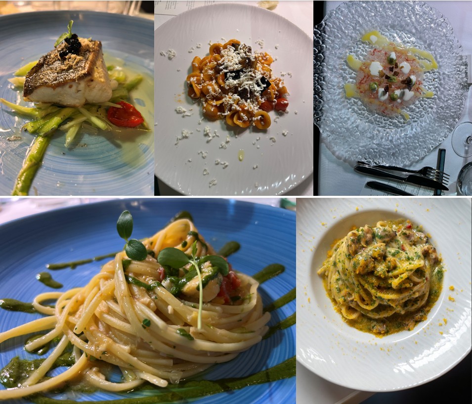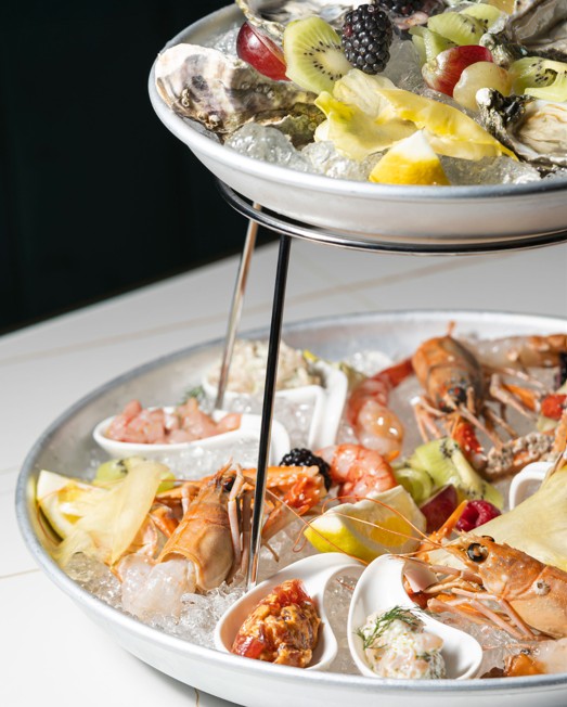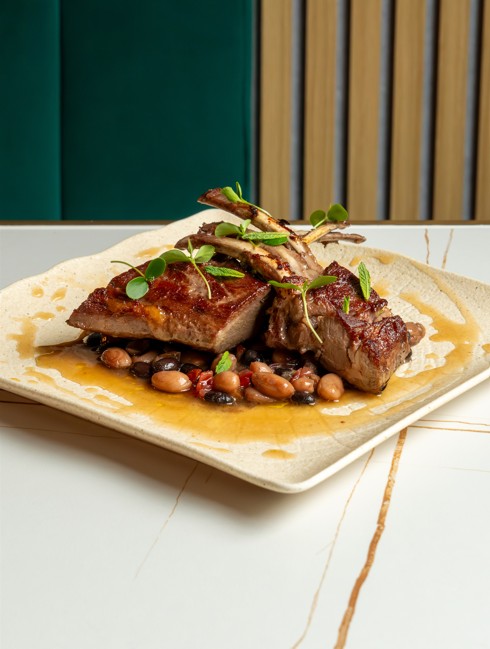 Costolette di agnello con fagiolini, pomodorini e menta. A chi cerca sapori più informali ma curati, la Paranza – frittura mista di calamari, gamberi e pescato – viene servita con verdure croccanti e salse aromatiche. I crudi trovano la loro massima espressione nel Plateau Royal, una selezione ampia e sempre diversa, creata in base alla disponibilità del mercato.