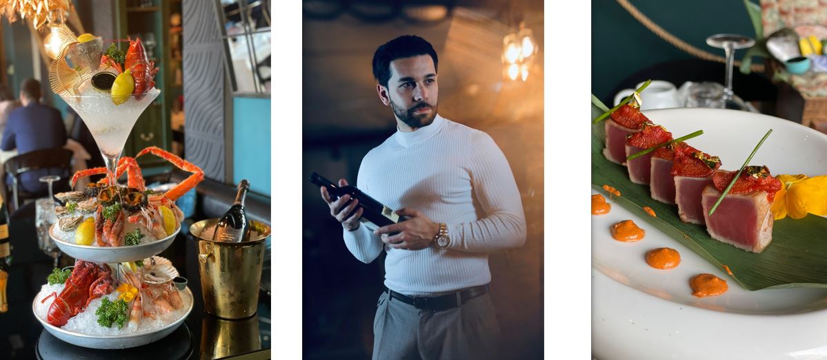“Plateau Black Diamond, con assortimento di crudo , ma anche cotto, con king crab, astice, aragosta, gamberi sbollentati, caviale, o plateau di sushi con assortimento dei migliori tipi da degustare anche come antipasto. Non mancherà la pizza rossa con burrata, gambero rosso di Mazara, granella di pistacchio e spolverata d’oro!”