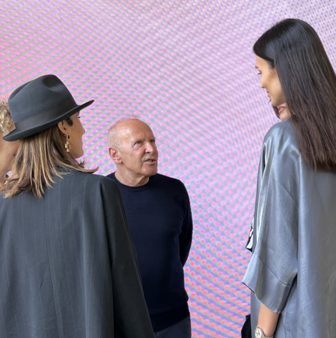 Era smagliante in un completo pantalone rosa intenso in chiffon, che attribuiva grazia e forzaall’altezza ed al piglio innato di protagonista. Amo Iva non solo perché è amica da tempo, ma perché incarna perfettamente la mia testimonial: mai in soggezione, anzi persona sicura, narrante un abito.