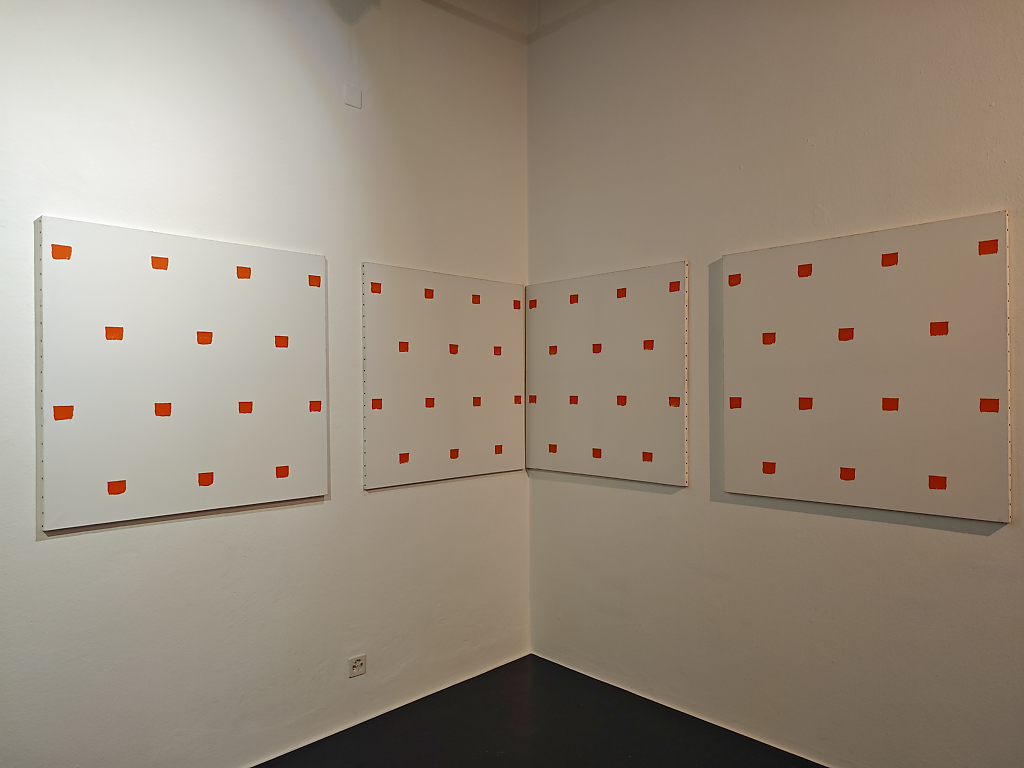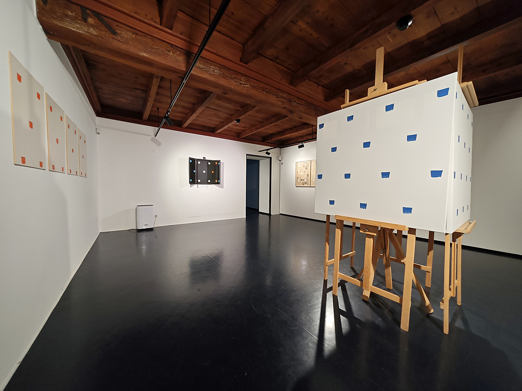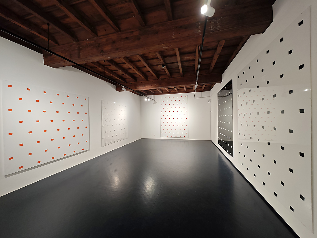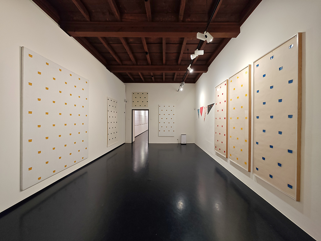 Le “impronte di pennello n. 50”, applicate in modo regolare a distanza di 30 cm l’una dall’altra, costituiscono il fulcro della pratica toroniana. Ma non si tratta di mero rigore meccanico: al contrario, l’esposizione di Locarno rivela la straordinaria versatilità di un linguaggio che, proprio nel suo vincolo, si apre a infinite modulazioni. È proprio in questa coerenza metodica che si rivela, con forza, la dimensione lirica e contemplativa dell’opera di Toroni.