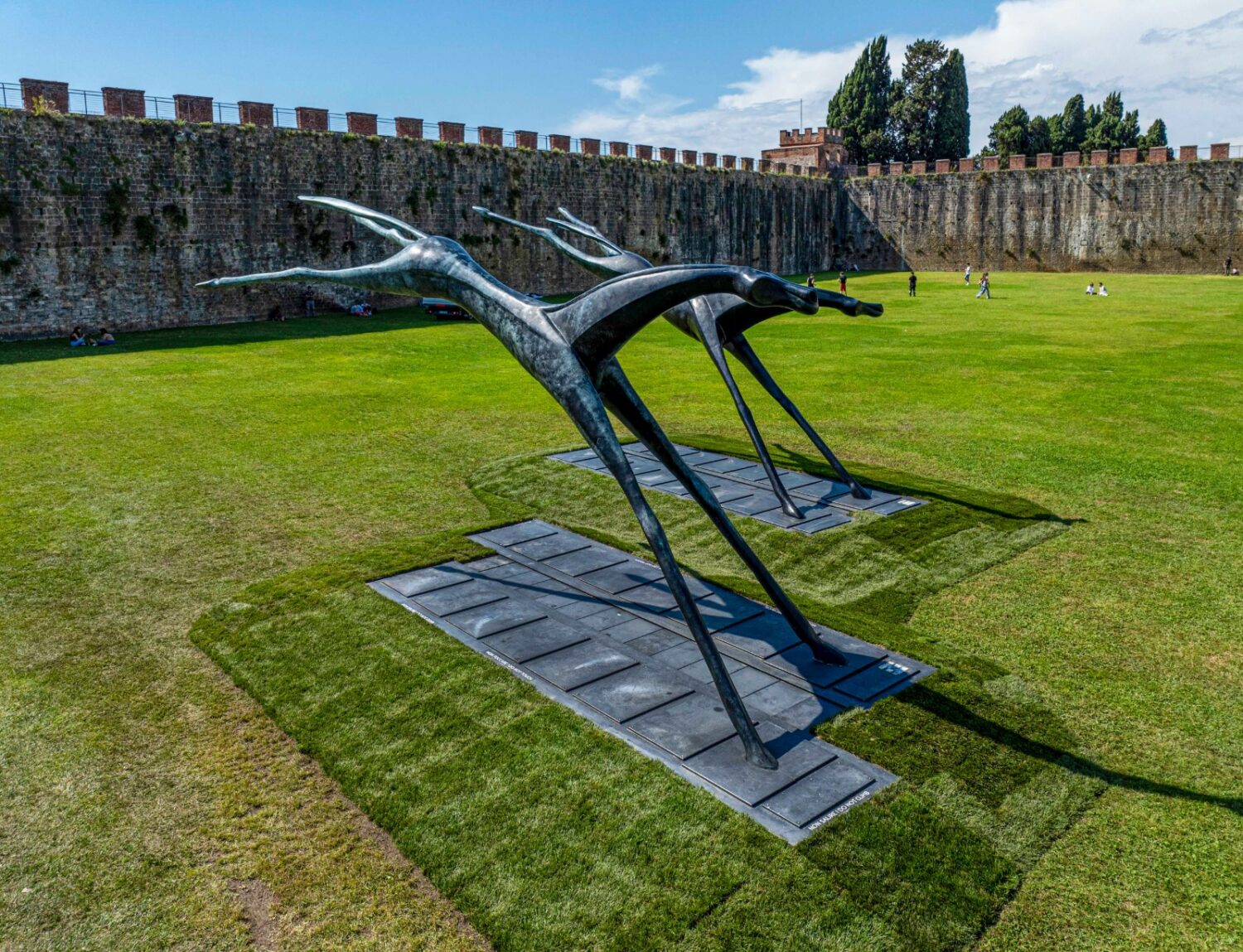 Arcturus e Sun i cavalli volanti di Antonio Signorini in Piazza dei Miracoli a Pisa. Si tratta di due sculture monumentali che compongono l’installazione (curata da Guido Curto), promossa dall’Opera della Primaziale Pisana in mostra fino 31 agosto 2025. Il Presidente dell’Opera, Andrea Maestrelli ha sottolineato che la scelta di ospitare le due opere in Piazza dei Miracoli si inserisce in un percorso che la Fabbriceria porta avanti da tempo: promuovere un dialogo autentico tra arte contemporanea e il patrimonio storico-artistico, dando vita ad una nuova narrazione aperta e dinamica. La scelta di Signorini è nata da due motivazioni: da un lato, il suo riconoscimento a livello internazionale, testimoniato da esposizioni in città come Venezia, Abu Dhabi, Istanbul, Dubai e Londra; dall’altro, la volontà di ospitare la prima esposizione di Signorini nella sua città natale, Pisa. Le sue opere si trovano in collezioni pubbliche e private, e per la prima volta sono ospitate nel centro più iconico e metafisico di Pisa. I due cavalli volanti, Arcturus e Sun, due bronzi monumentali di undici metri ciascuno, rappresentano un evento carico di emozione per l’artista che in questa installazione unisce l’amore per i cavalli e quello per la Piazza dei Miracoli. Con un passo elegante, un volo sulla Piazza più famosa del mondo, i due slanciatissimi cavalli in bronzo, di undici metri di lunghezza, sembrano esser approdati dal cielo per toccare terra sul prato che racchiude la Piazza. Ispirati alle pitture e ai graffiti rupestri delle grotte di Altamira e di Lascaux, i due ieratici cavalli vibrano entro quella essenziale stilizzazione, in Equilibrio (da qui il titolo dell’installazione) sulle zampe anteriori con gli zoccoli ben saldi al suolo. Questa iconologia trae spunto dalla grande passione per i cavalli che Signorini aveva maturato fin da giovane nell’allevamento di purosangue da corsa di suo padre. C’è il tema del viaggio nell’immagine equestre di Signorini; i viaggi che l’hanno portato via dall’Italia a Londra, a Parigi a Lascaux ad Altamura, a Gibilterra e poi di recente a lavorare negli Emirati Arabi, dove i suoi cavalli hanno riscosso un grande successo, tanto da essere esposti in numerosi luoghi pubblici. Arcturus e Sun, sottili e maestosi, recano in sé altri emblematici riferimenti. Lo scultore li ha costruiti per collocarli nel nostro tempo e per compiere un viaggio tutt’altro che finito. L’Ombra della sera, capolavoro anonimo dell’arte etrusca, (conservato nel Museo Guarnacci di Volterra) è la citazione accademica di Signorini. L’artista, come Matisse, si concentra sulla stilizzazione che riduce le figure a linee essenziali. La cifra ultima di Signorini è il suono ovvero il rumore degli zoccoli per terra quando i cavalli sono al galoppo. Cavalli che atterrano sulle zampe anteriori, per poi subito ripartire con slancio e non fermarsi mai. L’emblema del volo e del viaggio di Arcturus e Sun incontrano idealmente tutti coloro che ogni giorno entrano in piazza dei Miracoli per cogliere spiritualità, arte, bellezza e armonia. Il dialogo tra la Fabbriceria e l’arte contemporanea è un dialogo strutturato da lungo tempo. Piazza dei Miracoli e il complesso monumentale hanno ospitato artisti e scultori che hanno esposto le loro opere, da Arnaldo Pomodoro a Igor Mitoraj, da Giuliano Vangi a Greg Wyatt da Giuseppe Bartolini a Francesco Barbieri a Gianni Lucchesi. Pisa rappresenta da secoli un’autentica fucina di espressioni artistiche; ogni volta rinnova l’antica vocazione, puntando lo sguardo sull’arte contemporanea. Il dialogo tra l’arte del classicismo d’Occidente e quella dei tempi nuovi si rigenera di continuo e stupisce, all’ombra di quei monumenti che son patrimonio materiale dell’immaginario collettivo, in un rinnovato e mai interrotto Grand Tour dello spirito e della memoria.