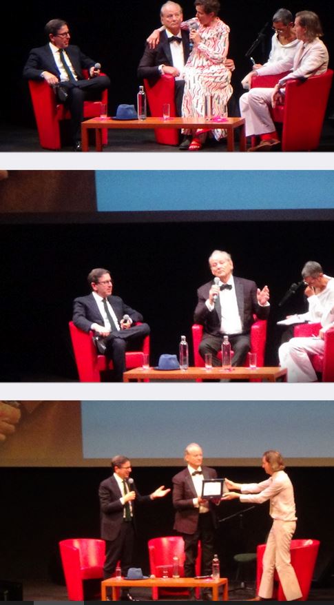 Un incontro che pareva quasi, e con Bill non può essere diversamente, uno show. Con una traduzione che non partiva a dovere per il pubblico presente, non si sa quanto voluto o forse magari era una sorta di sketch preconfezionato, e con le clip dei suoi lungometraggi. Da Tootsie a Ghostbusters, da Ricomincio da capo a Lost In Traslate e tanti altri. Citarli tutti sarebbe impossibile. Le clip cinematografiche hanno fatto da sfondo anche per dei complimenti effettuati da alcuni colleghi di Bill, quasi in sottoforma di auguri di buon compleanno. A sorpresa una piacevole incursione dell’attrice Frances Mcdormand la quale, una volta salita sul palco, si è seduta sulle ginocchia di Murray.