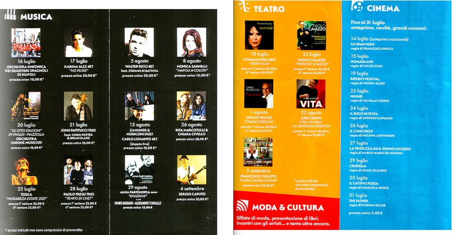La stagione teatrale del Teatro Salvo d’Acquisto di Napoli, dal 14 luglio al 5 settembre 2021 alle ore 21:00. Cinema, musica e teatro, al chiostro Istituto Salesiani di via Scarlatti.
