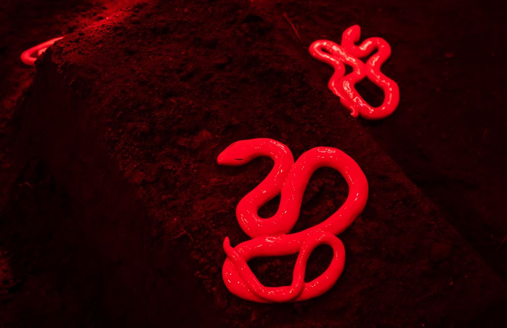 “L’aria miasmatica” (foul air), che un un tempo si credeva preannunciasse pestilenze, è diventata ispirazione per il titolo per la mostra dell’artista visiva Aleksandra Liput. Ecco perché a terra, nei suggestivi locali della galleria a via Oxilia a Milano, ci sono le mascelle con doppie file di denti, il cuore doppio che indica la presenza del vampiro, i serpenti che strisciano intorno ai cumuli di terra, appositamente adagiati per terra in un ambiente pieno di archetipi.