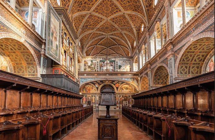 I milanesi camminano veloci per corso Magenta con lo smartphone all’orecchio. I turisti marciano disciplinati verso il Cenacolo di Leonardo con lo sguardo fisso avanti: hanno la cupola bramantesca di S. Maria delle Grazie come lontano (e invisibile) riferimento. Per tutti, come per le signore chic del quartiere in cachemire e filo di perle, il portone del numero 15 è un fastidioso restringimento: gli otto scalini arcuati costringono a rallentare il passo mentre a pochi centimetri sfilano sferragliando gli storici tram crema e giallo nati nel 1928 che stupiscono gli stranieri. Nei secoli scorsi il padre dell’estetica vittoriana John Ruskin e lo scrittore francese Standhal, milanese d’adozione per eccellenza, quei pochi gradini in granito li hanno invece saliti. E si è disvelato loro lo straordinario interno della chiesa di S. Maurizio al Monastero Maggiore che ha in Bernardino Luini il suo genius loci. Luini vi operò con la sua scuola dal 1522 al 1529, ritraendo storie di santi, parabole, episodi della vita di Cristo e biblici. Un capolavoro della pittura rinascimentale lombarda mirabile ed emozionante, una galleria di volti, scene, quadri e affreschi che Vittorio Sgarbi ha definito la Cappella Sistina di Milano.