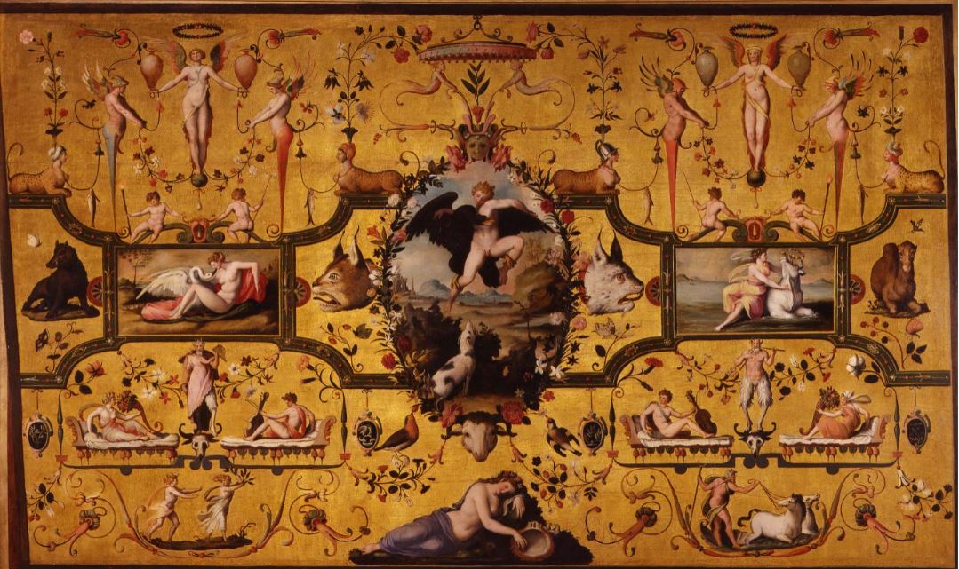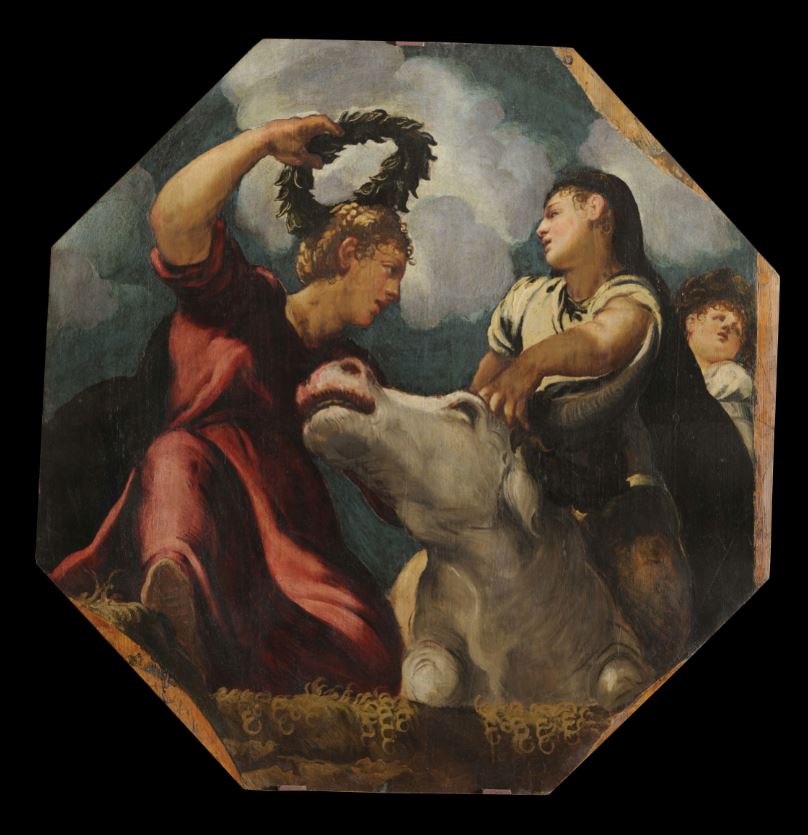Successivamente le tre splendide statue (prestate dall’Istituto Villa Adriana e Villa d’Este – Villae) e l’affresco pompeiano della sala dedicata al mito di Niobe, la sventurata cui Apollo e Artemide uccisero i 14 figli, per punirla di colpe che a noi appaiono del tutto inconsistenti. Non resistendo a tanto dolore Niobe pregò Giove di trasformarla in roccia e venne accontentata. Questi casi di punizioni crudeli e sproporzionate rispetto alle offese arrecate appaiono ai nostri occhi come vere e proprie denunce di Ovidio contro le sopraffazioni della società in cui viveva. Come appare evidente dallo snodarsi della mostra, il poeta è molto critico nei confronti degli dei di Augusto: Giove, perduta ogni aura di divinità, è rappresentato come un seduttore focoso e un insaziabile libertino. Controllato e inseguito da Giunone che cerca invano di bloccare le sue infedeltà, mette in atto qualsiasi espediente per conquistare fanciulle innocenti, ninfe, efebi. Lo testimoniano un “Ratto di Europa” di Tintoretto, un “Leda e il cigno” copia da Leonardo e magnifici crateri ed anfore campane.