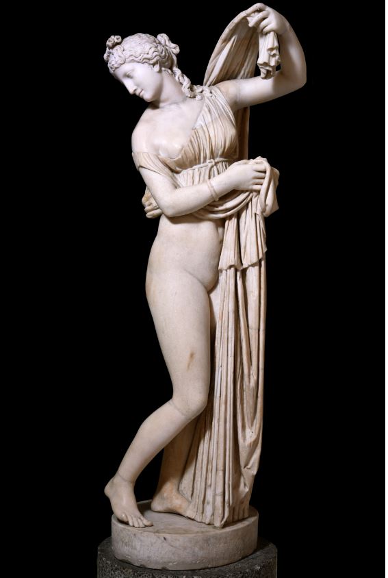 La Mostra si snoda su tre piani: se vi si accede dalla bellissima scalinata delle Scuderie si viene accolti da un ritratto di Ovidio come immaginato da Giovanni Battista Benvenuti, pittore della metà del ‘500. Nella sala sono esposti anche testi miniati dal ‘300 al ‘500. La sala successiva è dedicata all’amore, cantato da Ovidio in tutte le sue forme: mondano, mitico e come disciplina. Domina e incanta la statua della “Venere Callipigia”, “le più belle terga del mondo antico”, come commenta maliziosamente il pannello evocativo, circondata da Eros con l’arco, Afrodite e Venere. Sullo sfondo l’affresco di un giardino come luogo di delizie e abbandono erotico, proveniente da Pompei. Sono molti gli affreschi qui ritrovati con immagini riferite alla poetica di Ovidio, testimonianza evidente di come la sua filosofia di vita facesse presa sulla società dell’epoca. Proseguendo: statue di Antonia Minore rappresentata come Venere Genitrice e una di Livia contrapposta a quella di Augusto in toga e col capo velato, testimonianza della sua spinta alla moralizzazione dei costumi. Ma si ammirano anche “Una Venere Pudica” di Botticelli su tela esposta vicina a una statua di “Afrodite Pudica”. Si passa poi agli amori adulterini con un affresco da Pompei e un quadro della metà del ‘600 su Marte e Venere sorpresi da Vulcano durante l’amplesso.