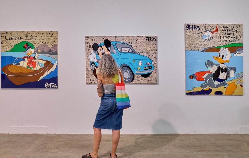 Un’esplosione di colori, figure irriverenti e denunce sociali provocatorie celate sotto un velo di ironia: questi gli ingredienti dell’esposizione di Edward Spitz. Sovrapponendo “icone” dipinte a mano alle pagine di originali fumetti d’epoca e sigillate con uno spesso strato di resina, esprime in modo ironico e provocatorio i paradossi della società di massa attuale. La sua genialità risiede nel fatto che la sua denuncia sociale è sottolineata in modo armonioso con il personaggio rappresentato, creando un’esplosione di colori e figure irriverenti.