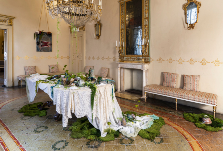 Più avanti, nella sala da pranzo, What grows after us (2025) si sviluppa sotto un soffitto decorato con cieli stellati: un tavolo da banchetto appare sopraffatto dal tempo, dove merletti e minerali si fondono in una reliquia sospesa tra passato e futuro. Alle pareti due opere della serie Lorelei (2024) sublimano l’idea di un ambiente acquatico salino, riproponendo superfici fluttuanti attraverso manipolazioni fotografiche di anfore di rame immerse nell’acqua. Tradotti in trama tessile e arricchiti da fiori simbolici come amaranto, gelsomino e ortensia, i due arazzi evocano una dimensione sospesa, uno spazio in cui il tempo sembra dilatarsi.