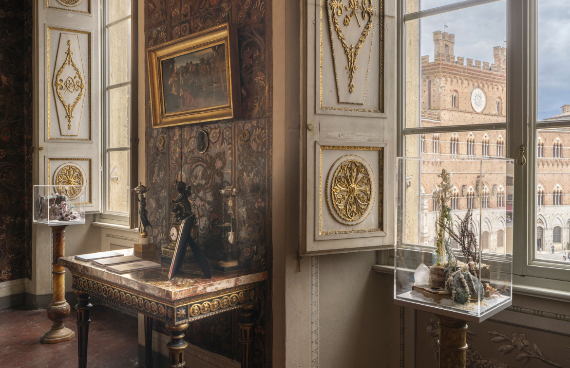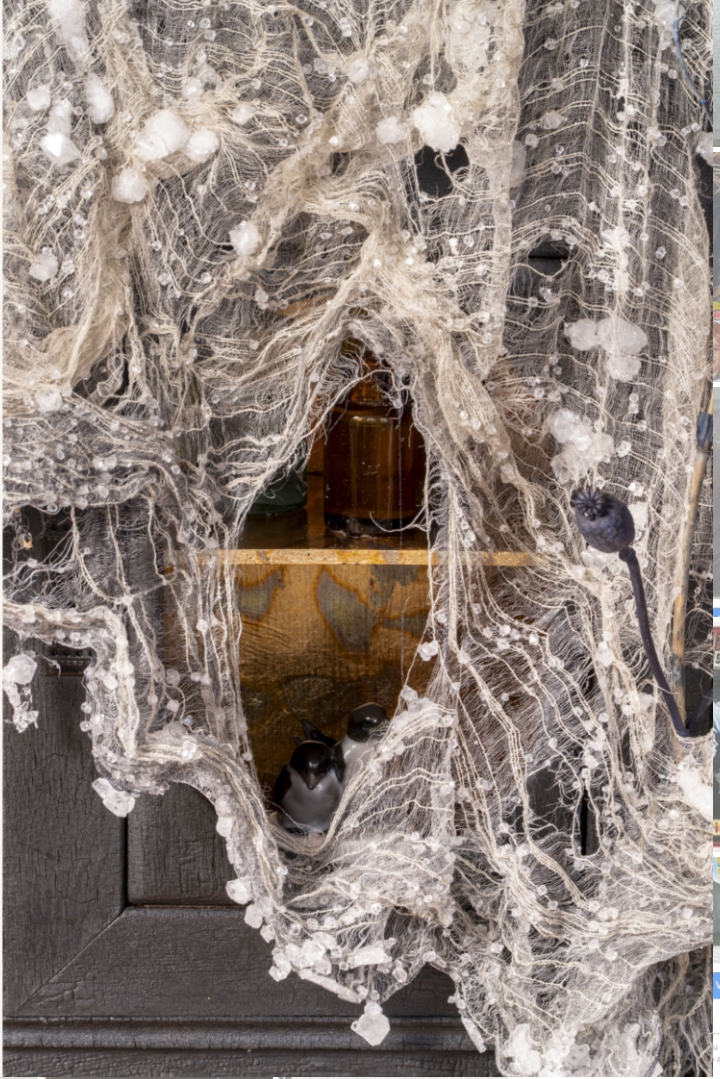Tra le stanze del palazzo, le vetrine della serie Bloom si presentano come portali verso universi di vita dormiente. Ispirate alla vita del crostaceo Megabalanus tintinnabulum, riflettono sul concetto di staticità e sedimentazione della memoria. I materiali organici ricoprono oggetti di epoche passate, che, attraverso processi di cristallizzazione, assumono forme nuove in continua evoluzione. I Cabinet (2024-2025), invece, rievocano le cassette di medicinali novecentesche, contenitori di frammenti di natura cristallizzati: conchiglie, sali e muschio trasformano questi armadietti in reliquie sospese tra cura e dissoluzione.