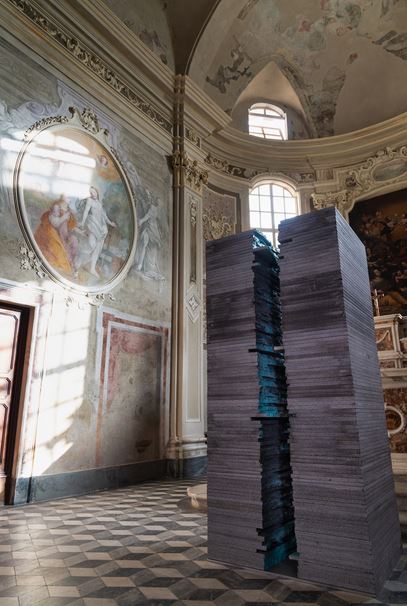 Quando si entra nella chiesa del paradiso dell’arte che è questo borgo antico in provincia di Lucca, si è investiti dalla rottura come rituale di ricerca artistica. Moses si presenta come un monumentale monolite in pietra lavica dell’Etna ceramizzata posto davanti a quello che un tempo era l’altare della chiesa. Pone degli interrogativi, si lascia guardare e soprattutto non è evitabile.
