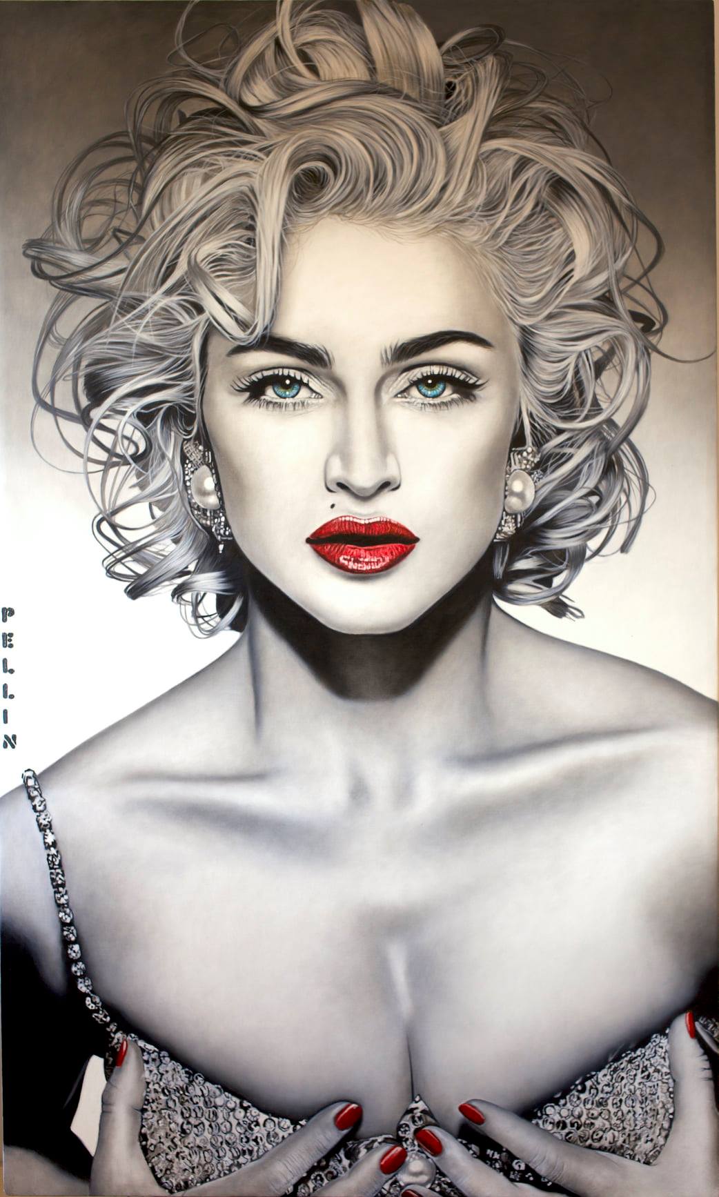 “Breakfast at the Red Door” – Dipinto a olio su tela di Cinzia Pellin. I ristoranti Red Door nel Kansas sono locali di prossimità raffinati. Con questo posizionamento, hanno voluto includere l’arte di Cinzia Pellin alle loro pareti. Kansas City Bomber: Rachel Welch, olio su tela di Cinzia Pellin. La Marilyn di Cinzia Pellin. Madonna – Cinzia Pellin Sophia Loren e Sensuality