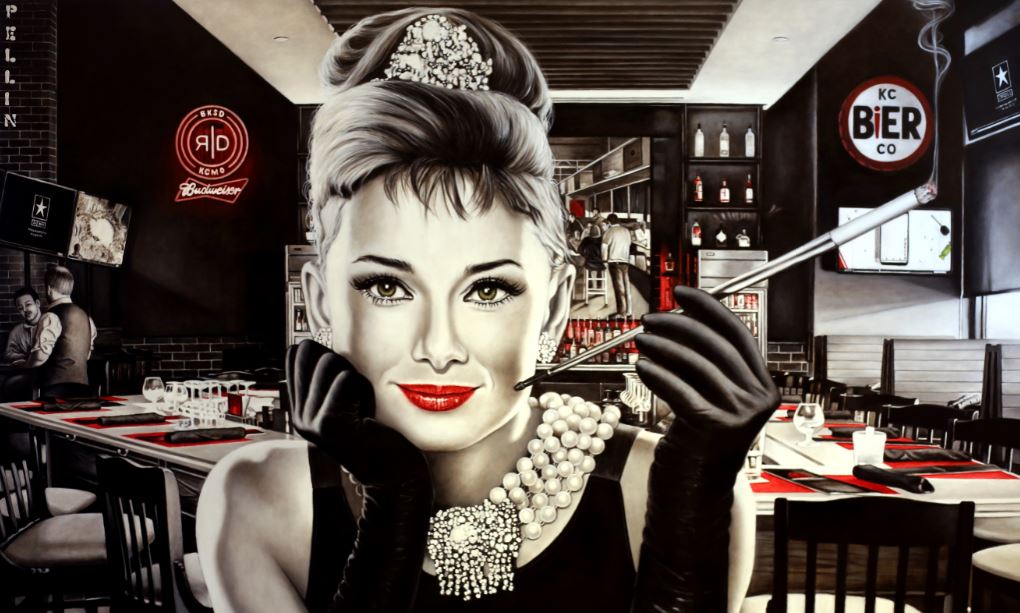 cui protagonista è l’attrice Rachel Welch rappresentata nel dipinto. “Nelle altre due opere mi sono state richieste Sophia Loren e Audrey Hepburn. Per cui ho dipinto “Tribute to Sophia” e “Breakfast at the Red Door” con Audrey Hepburn entrambe di 200 x 120 cm ad olio su tela. In quest’ultima ho deciso di inserire il bellissimo bancone del loro nuovo locale come sfondo a