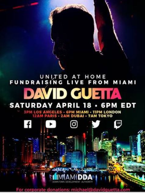 Lo streaming live di 2 ore sabato 18 Aprile a sostegno della lotta globale contro la pandemia da COVID-19 è stato mandato in onda da una location speciale sita in Downtown a Miami e raccoglie fondi per la World Health Organisation, Feeding South Florida, Feeding America, e la fondazione francese Hôpitaux de Paris.