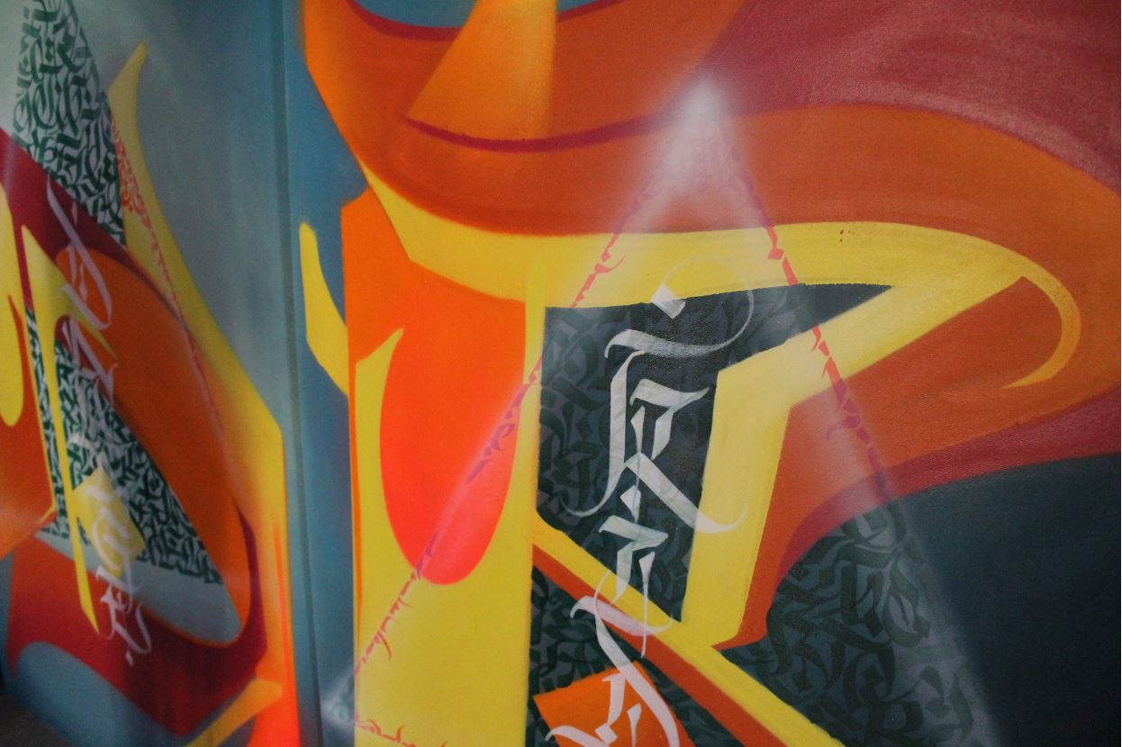 Davide Smake usa pennello, pennino a china, marker o qualsiasi strumento con punta piatta, spazia dal colore acrilico agli spray, rimanendo fedele al suo stile: dal mix di segni calligrafici occidentali, rigidi, ed orientali, più morbidi.