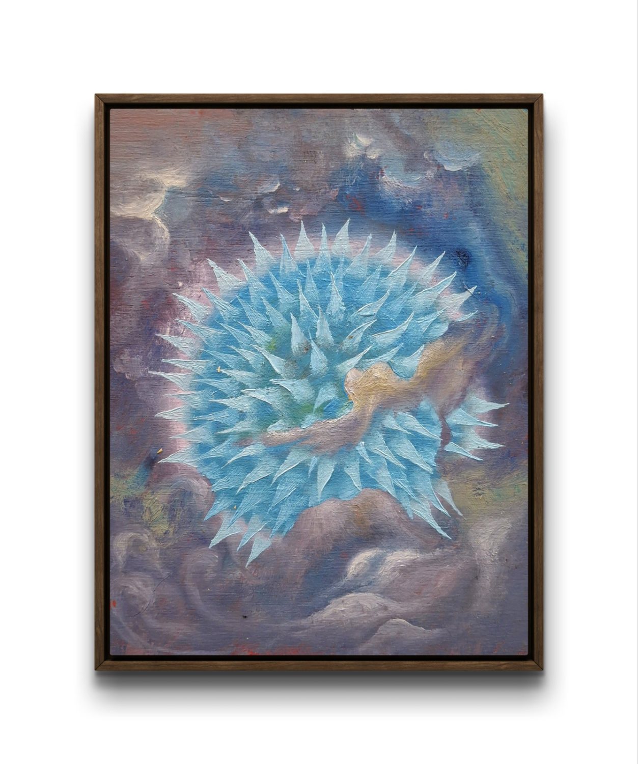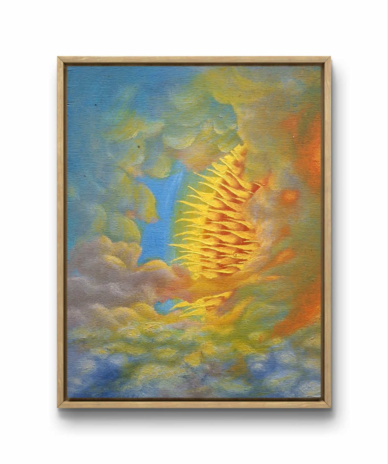 - Il sole da giovane: una serie di piccoli dipinti a olio su tavola, dove il sole appare nel suo stato adolescenziale, pulsante di energia e forza creativa. I confini delle cornici sembrano contenere un frammento di universo, enfatizzando il concetto di tempo circolare e in continua evoluzione.