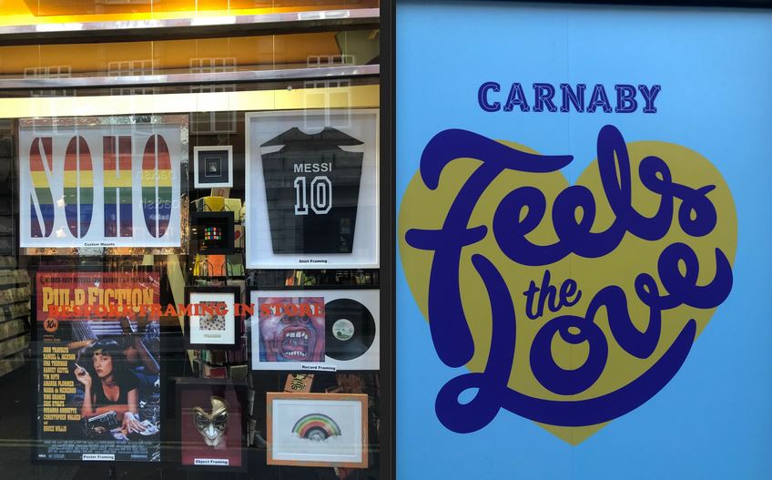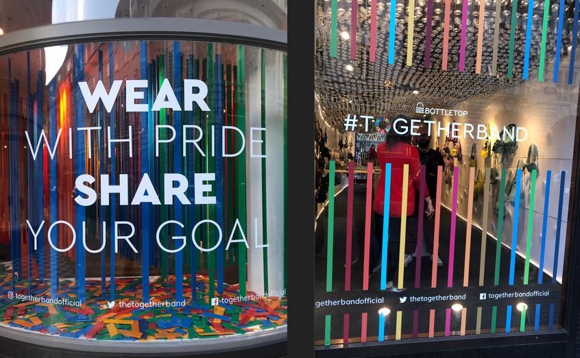A Londra le vetrine pullulano di tematiche arcobaleno, non necessariamente nelle zone gay friendly. Addirittura Carnaby Street ha esposto la dicitura “Carnaby Feels the love”, il quartiere Soho ha ridisegnato il suo logo con l’inserimento dell’arcobaleno nel merchandising. E Togetherband ha vetrine tematiche.