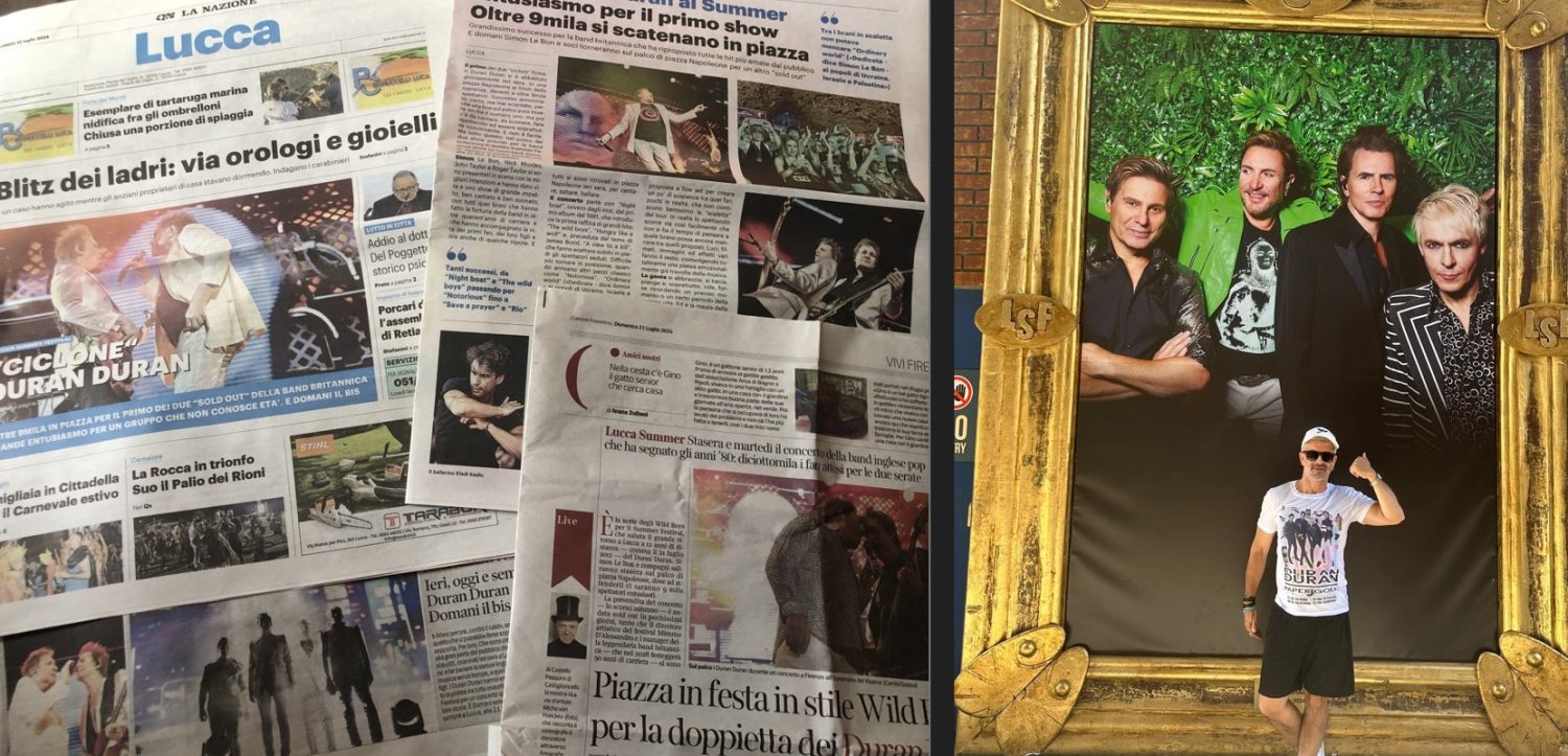 Entusiasmo alle stelle per i Duran Duran nella piccola cittadina toscana di Lucca. La band tiene due concerti sold out nell’ambito del Lucca Summer Festival 2024. La stampa locale parla di “ciclone” e i fan si scattano selfie davanti alle gigantografie della band disseminate lungo le strade. (Foto di The Way Magazine). C’è uno stretto legame tra il festival e le realtà imprenditoriali di prestigio del territorio. Il connubio tra il brand lucchese di orologi U-Boat e Lucca Summer Festival è confermato da una sponsorship di successo iniziata lo scorso anno con la realizzazione da parte di U-BOAT di un orologio in edizione speciale per celebrare il 25° anniversario della manifestazione. Il marchio è presente nei luoghi del Festival anche durante i giorni del suo svolgimento.Da sinistra Simon Le Bon (cantante), la batteria di Roger Taylor, John Taylor al basso e Nick Rhodes alle tastiere e alla macchina fotografica, sua grande passione. A destra in foto il session guitarist Dom Brown.Simon Le Bon, per molti voce simbolo del pop anni 80. Il cantante nel primo concerto di Lucca ha ricordato un curioso aneddoto risalente al primo tour italiano della band nel 1987: “Ho aperto un giornale e c’era un fumetto raffigurante lo stadio San Siro dove tenemmo un concerto. E sopra la frase: Save a Prayer”.