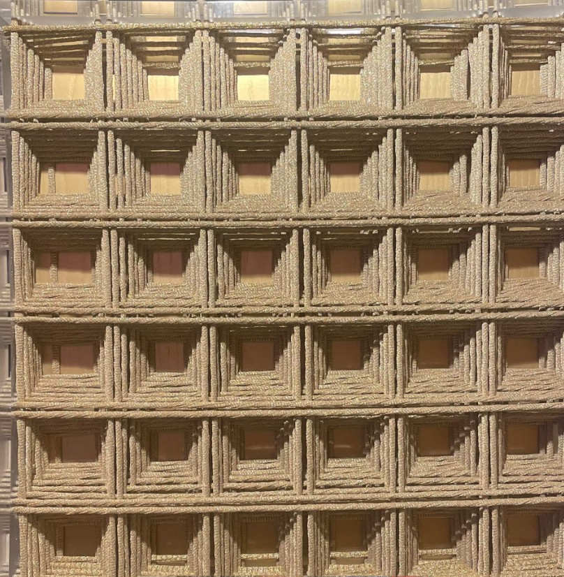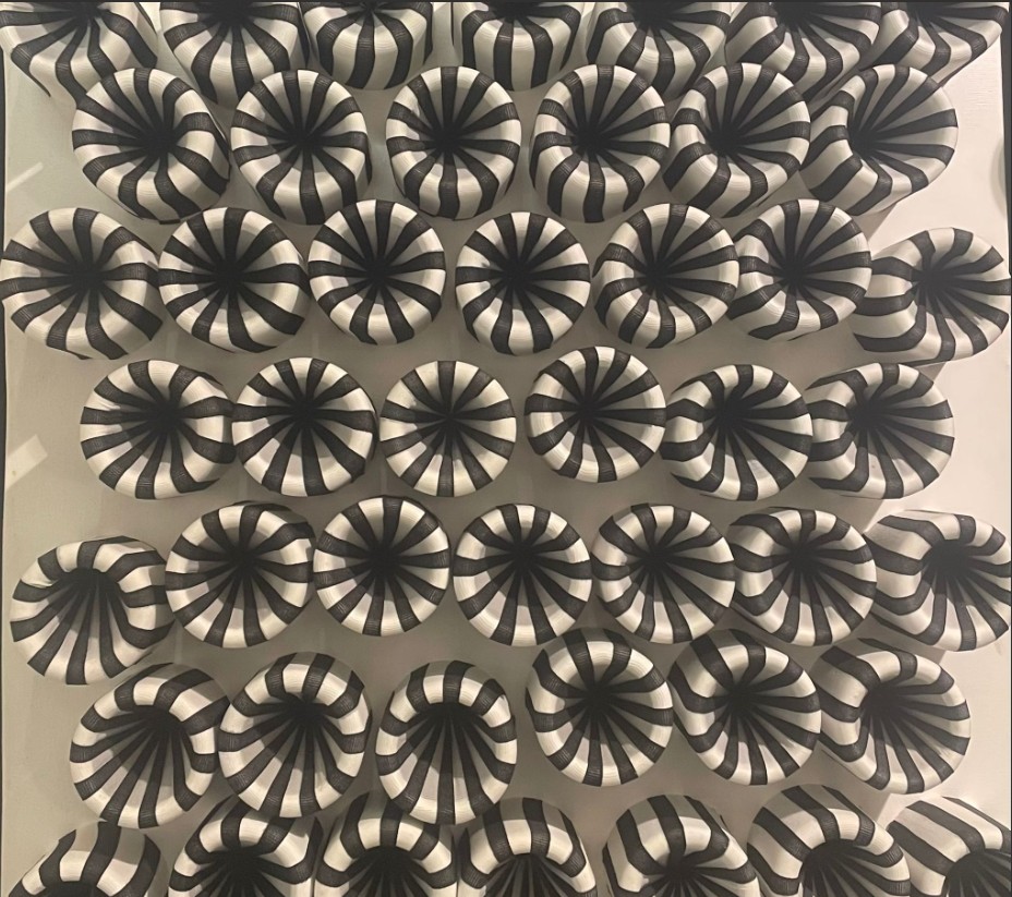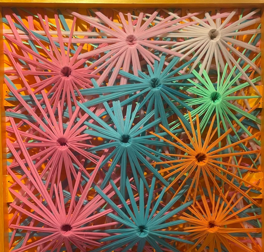 «In questa mostra presento una selezione di opere in cui la calza diventa il pennello o il filo conduttore di tutti i quadri, da cui si può intravedere un futuro per la calza stessa» – spiega l’artista – «La mia arte è pittura oggettuale ossia quadri oggetto. Una ricerca dei complessi rapporti tra spazio, luce e forma con un’astrazione geometrica in 3D».
