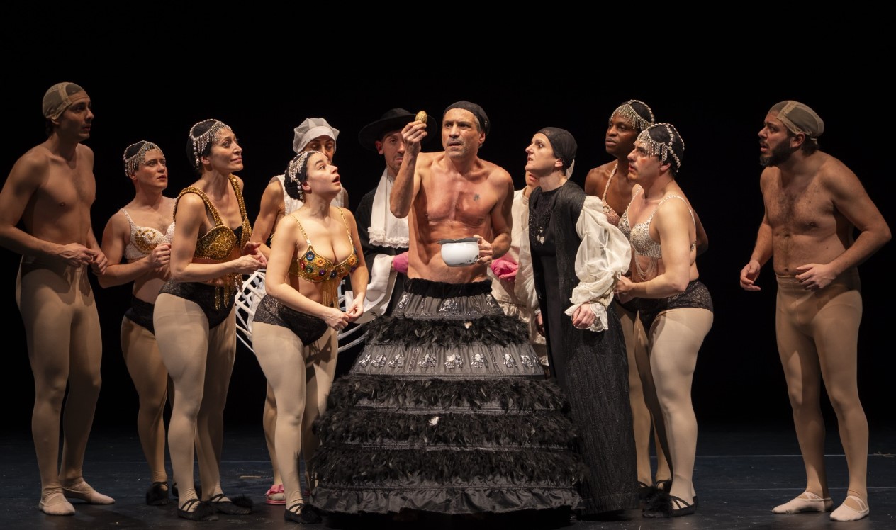 Gli interventi sul testo che la regista opera sono quanto mai opportuni per rimarcare il lato tragico di questo triste apologo sul potere. Da qui, ad esempio, l’espunzione del lieto fine basiliano con le due contadine proprietarie della gallina che si palesano come un deus ex machina ad estrarre il pennuto dal regale deretano. In questa versione, il finale – che non anticipiamo – è ben più amaro ma, se vogliamo, spettacolare. Il tutto, comunque, sempre giocato sul registro dell’ironia, del grottesco, dell’eccesso che rende lo spettacolo fortemente comico grazie anche a quell’incanto linguistico del napoletano italianizzato barocco e aulico, anche quando il discorso si fa scatologico: in questo contrasto si raggiungono vette di comicità sublime. Il resto è affidato alla bravura degli interpreti i quali, come veri comici dell’arte, si vedono impegnati in lazzi fisici e verbali sia in spumeggianti scene d’insieme che in istrionici assoli o numeri a due o a tre. A cominciare da Carmine Maringola (irresistibile Re Chicchinella), Annamaria Palomba e Angelica Bifano (infide Regina e Principessa), per proseguire con tutti i componenti della compagnia che, a vario titolo e in momenti diversi, offrono guizzanti pennellate per comporre un affresco vivido, emozionante, gustosissimo. Vale la pena nominarli tutti: Viola Carinci, Davide Celona, Roberto Galbo, Enrico Lodovisi, Yannick Lomboto, Davide Mazzella, Simone Mazzella, Samuel Salamone, Stephanie Taillandier, Marta Zollet. Attori e attrici di grande livello diretti con maestria dalla sapiente mano di Emma Dante (dal cui estro prendono forma anche gli elementi scenici e i ricchi costumi), che sa sempre fin dove si può spingere per creare spettacoli energici, ben ritmati, comici e che facciano – al contempo – riflettere. Quello in questione è senza dubbio tra i suoi migliori, come attesta il trionfo di applausi tributati alla prima.