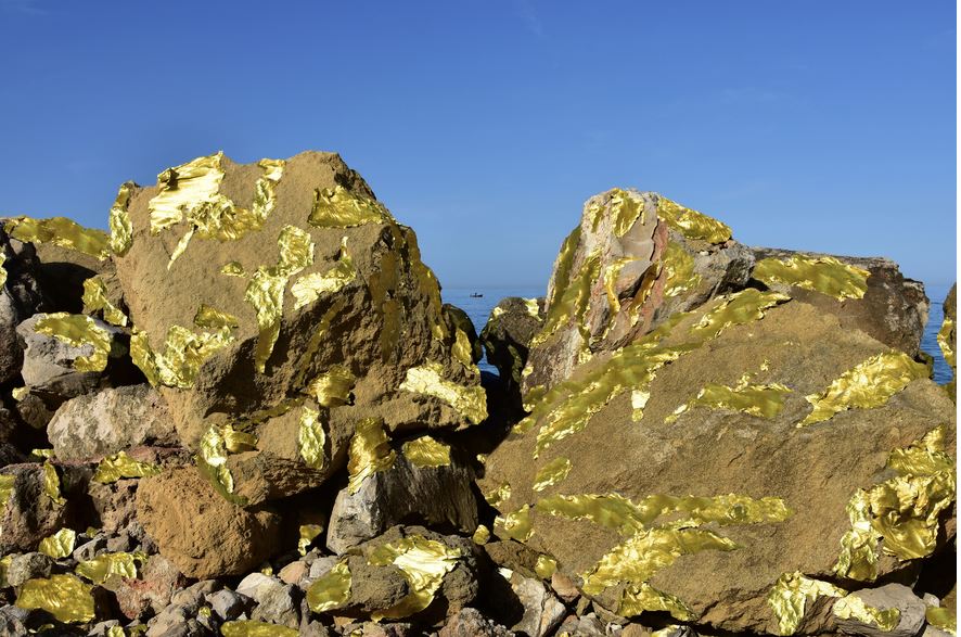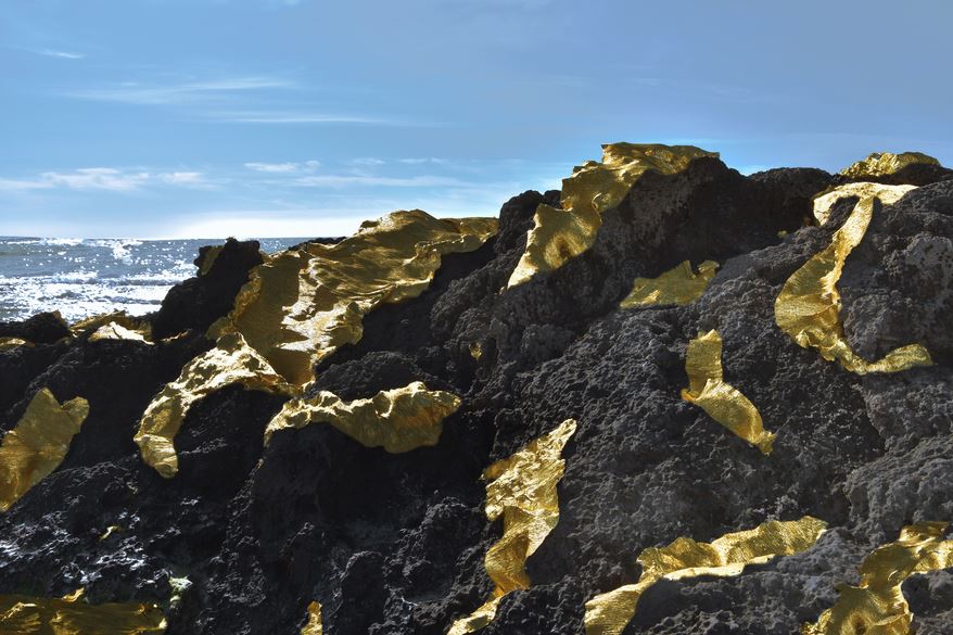 “L’applicazione della lamina in oro su roccia vuole richiamare l’antica tecnica Kintsugi, l’arte giapponese che rende più pregiati i manufatti valorizzandone le fratture, e il concetto di resilienza, accentuando quella che è l’essenza sacrale dalla terra e la sua dimenticata fragilità. L’opera insiste sui valori di soglia e limite, mette in luce il vuoto creato dagli eventi traumatici subiti dalla Terra. Panorami spezzati, irricomponibili nelle loro geografie, sono al centro dello studio che indaga la capacità del sistema di rispondere alla crisi ambientale: la resilienza ecologica sembra essere in contrapposizione a quella socio-economica. Le narrative della terra negli ultimi decenni hanno evidenziato la vulnerabilità della biosfera e hanno sottolineato l’urgente necessità di ricercare una visione olistica in cui possano coesistere i bisogni dell’uomo e quelli della natura. L’oro abbraccia la roccia e testimonia l’impossibilità di riportare allo stato originale ciò che ormai è spaccato. Eppure, la bellezza dei paesaggi regala ancora la speranza di un cambiamento verso un’umanità che avrà cura di ciò che resta del proprio pianeta, delle sue forme irregolari e irripetibili.”