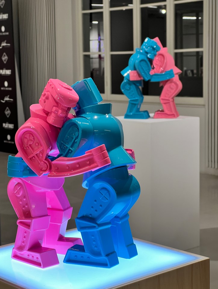 Per questo la mostra “Playdult” con la partnership della Mattel a Milano è un’occasione abbastanza unica per vedere come il mondo dell’arte abbraccia le suggestioni del giocattolo di consumo. Siamo in ambito pop, con l’irriverenza e riferimenti culturali di questo giocoso e variegato mondo. Eppure Fidia colpisce per la sua carica di eterno bambino che vuole stupire. E a volte far riflettere. Come in BRB (Be Right Back), l’installazione di BarbieTM in cui la bambola non si vede. Ma è presente nei molteplici oggetti (anche un telefonino) e il suo logo riconoscibilissimo. Attraverso il lavoro artistico, Fidia Falaschetti racconta al pubblico che Barbie ha lasciato una sedia vuota e le sue iconiche scarpe rosa con un giocoso post-it che sembra lasciato lì a caso.