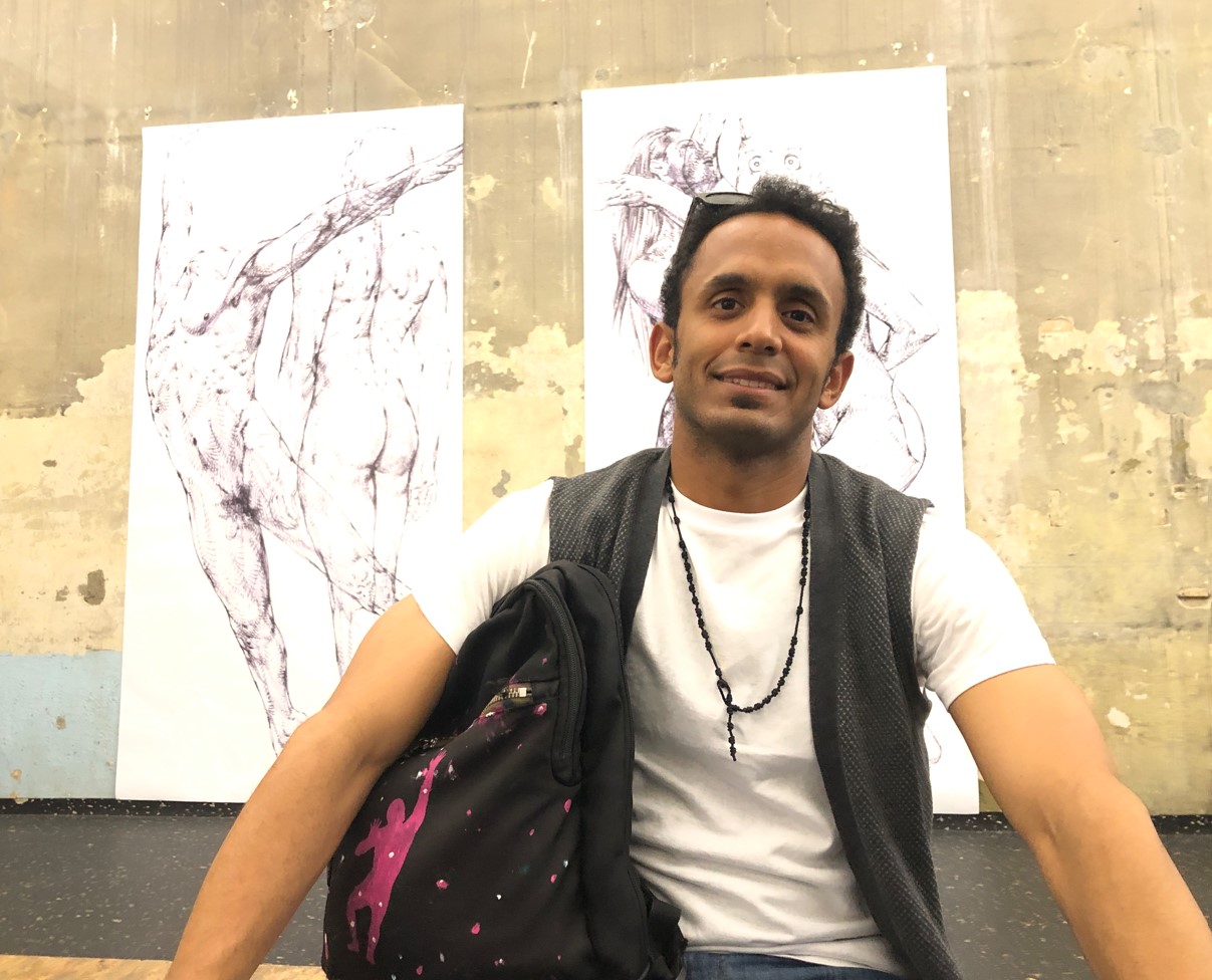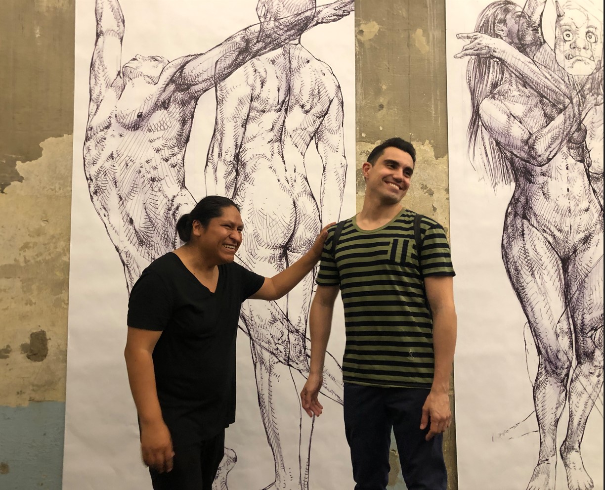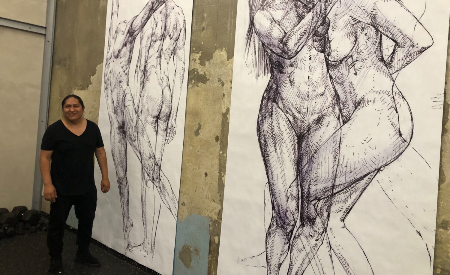 Giovanni donne, corpi in torsione e distensione, farfalle, tucani, ritratti storici, scimmie, muscoli scolpiti, corpi eterei e carnali. Tutti soggetti nelle carte di grandi dimensione che Gio Manzoni ha meticolosamente disseminato nello spazio di Ripa di Porta Ticinese, con dettagli che sorprendono, bicromie scrupolosamente selezionate, così esteticamente versatili che fa effetto vederle nella loro magnificenza da lontano. E poi avvicinandosi il classico effetto sorpresa, quando si notano le perizie anatomiche che sgorgano dai disegni, i corpi che emanano forza e parlano allo spettatore.