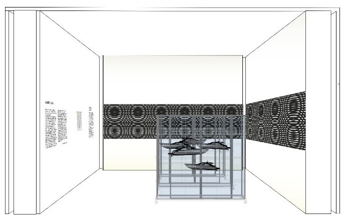 Esposti in sequenza lungo un lato della lounge, all’interno di teche in vetro, i modellini metallici dei Superyacht Sanlorenzo rifletteranno i pattern visivi dell’opera modificandosi e muovendosi con lei in un dinamismo percettivo ed emotivo.