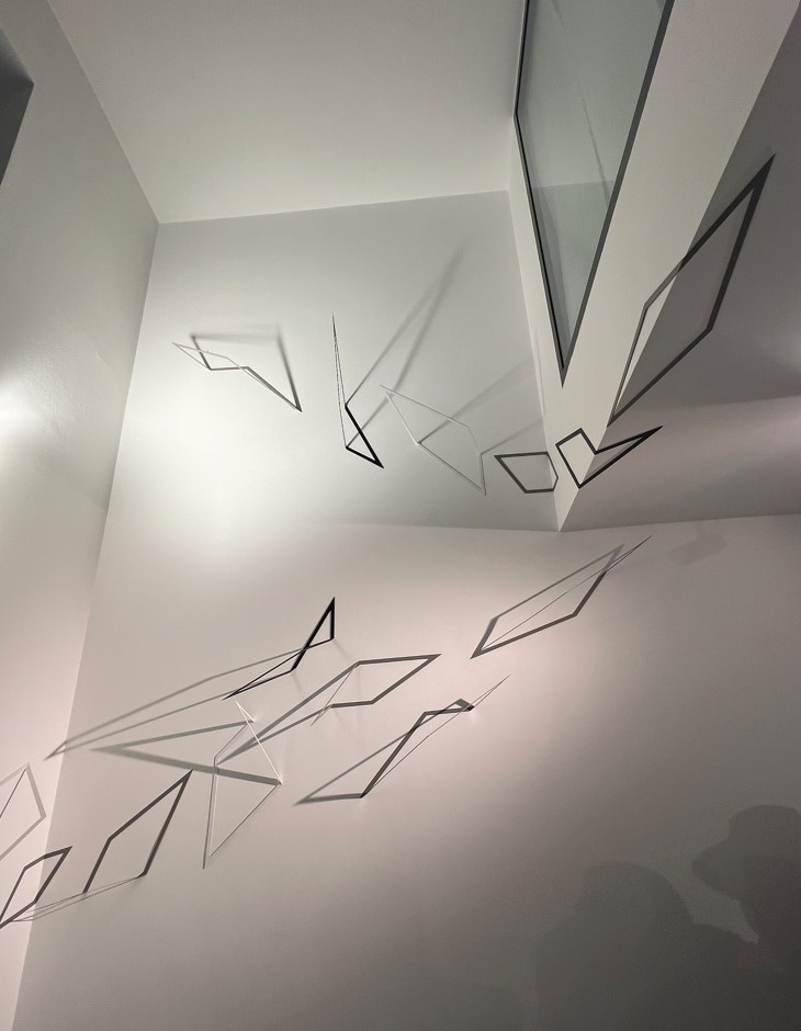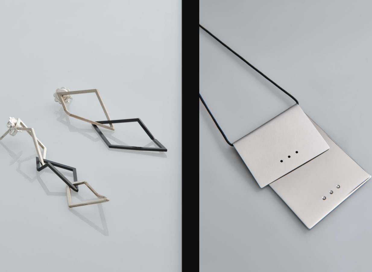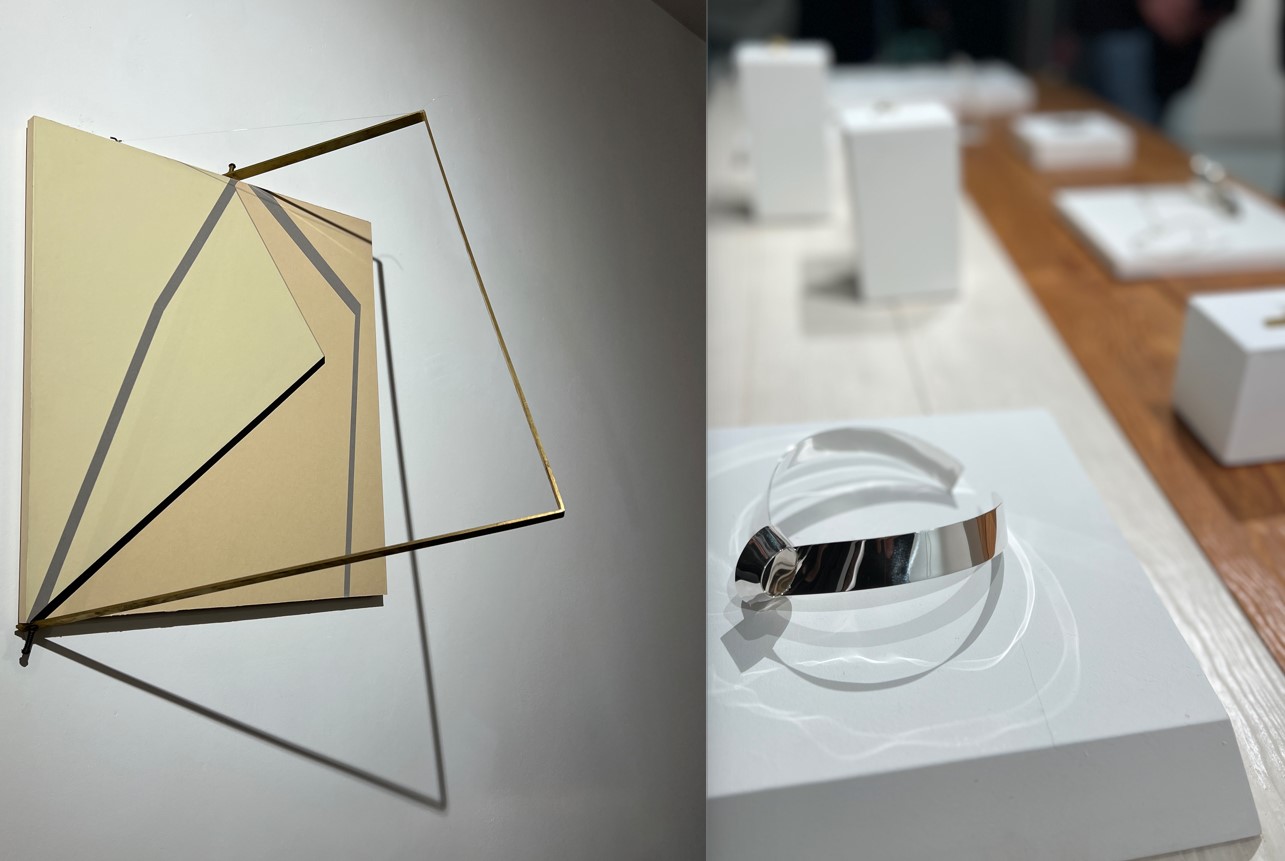 Una dinamicità che si legge bene nei gioielli in mostra, frutto di un lungo lavoro: “A nodo mio” (2022-2024), da cui l’esposizione prende il nome, sono due collane d’argento e due orecchini d’oro (ciascuno in edizioni di 9 pezzi) che racchiudono tutta la sofisticata semplicità del suo pensiero. Le lamine metalliche sono tagliate e ripiegate in un’alternanza di sospensione e leggerezza che richiama i segni puliti e precisi delle sue sculture Meridiane (1974). Lo stesso principio di Penta (2024), in argento satinato che ha forme geometriche e rigorose. Qui si ammira il processo di creazione che esalta il ritmo, la perfezione degli incastri, le vibrazioni di luce, in un’armonia quasi musicale.