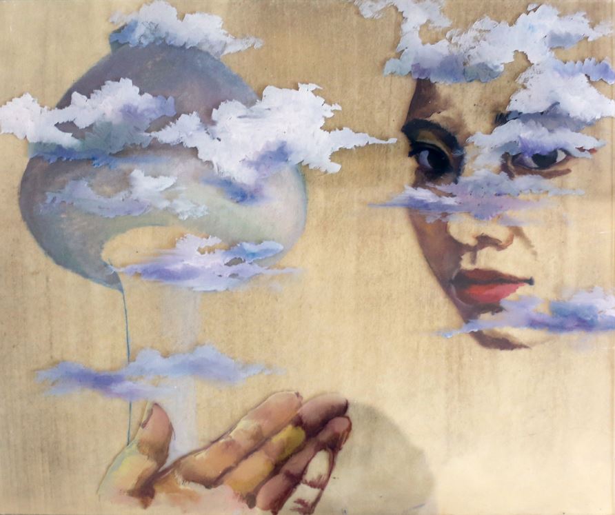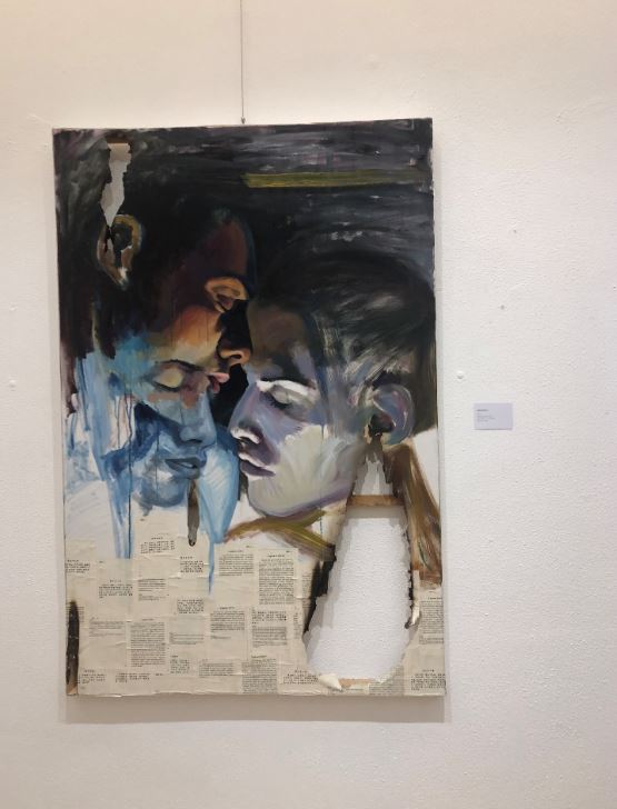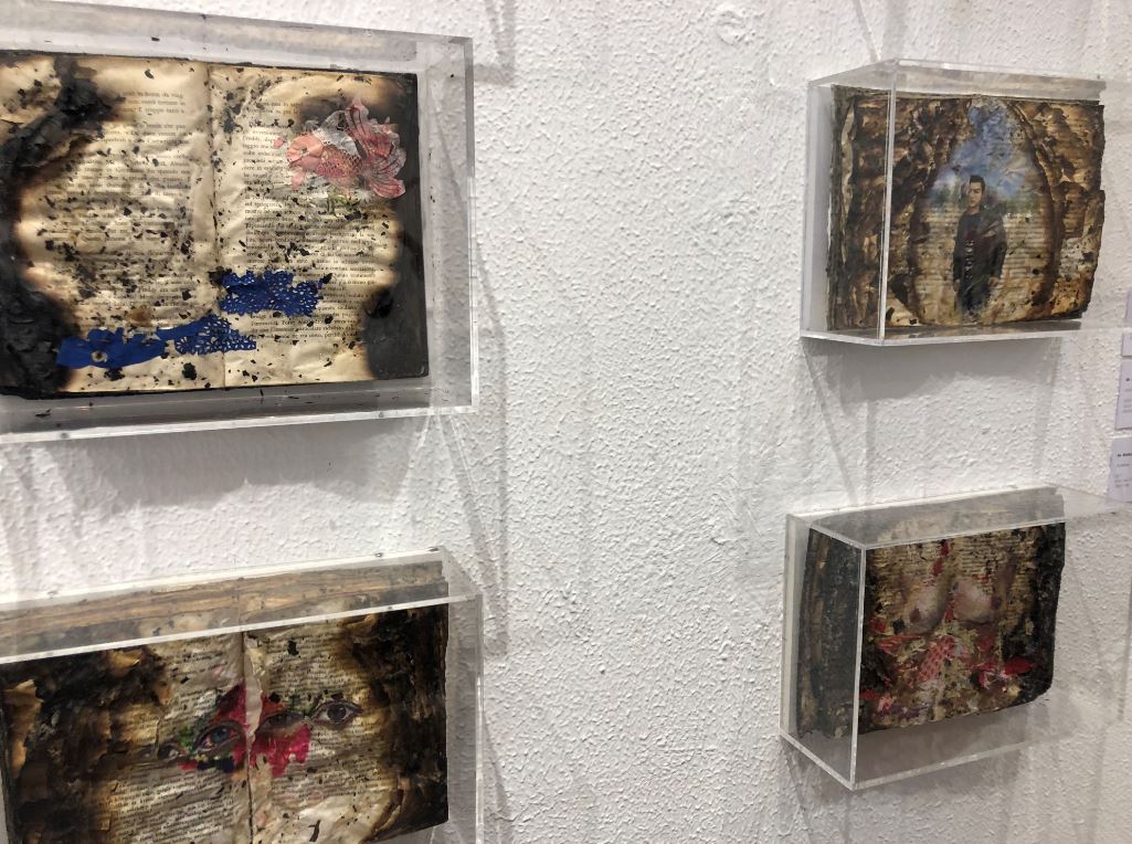 L’artista brucia una parte di manufatti storici come libri vecchi o antichi per aprirli e incollarli così da diventare supporto pittorico di ritratti, occhi, bocche, gesti ed espressioni che funzionano coralmente, fissando nel presente la loro storia e trasformando il corpus dei libri un’installazione di attimi dipinti sulle parole.