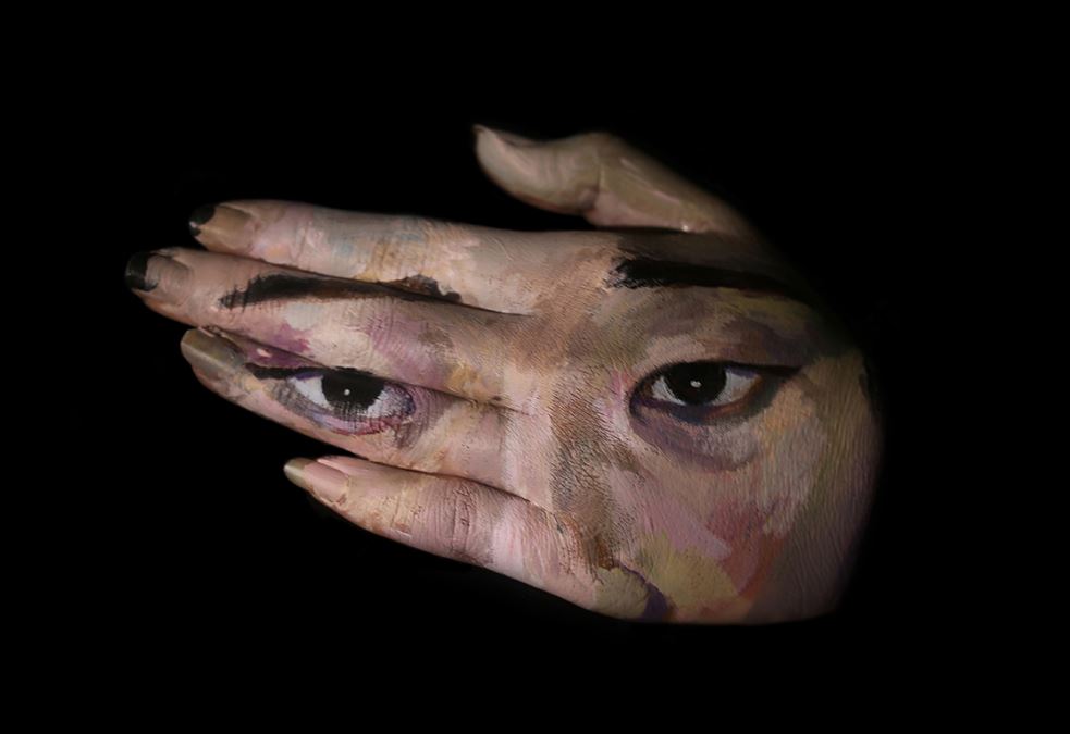 Nella logica del gioco, come in un trompe l’oeil o in un giardino di delizie cinquecentesco, le mani e il busto nudo con body painting, il volto attraverso le lenti, sono protagoniste dei tre video del 2017 “Il fiore nello specchio e la luna nell’acqua“. Un gioco con l’illusione ottica tra vero e verosimile/dipinto ci attira nella sala del piano seminterrato, allestita con dei frame dei video e la proiezione in loop.
