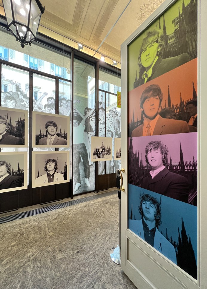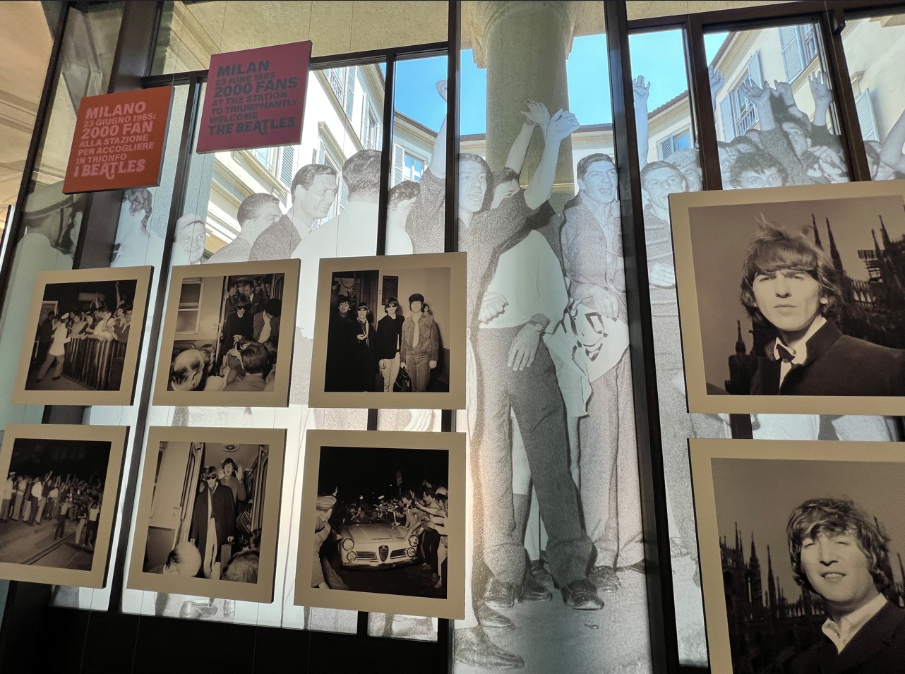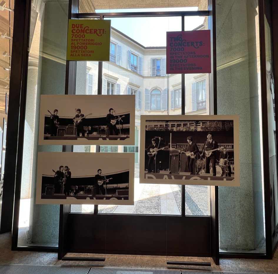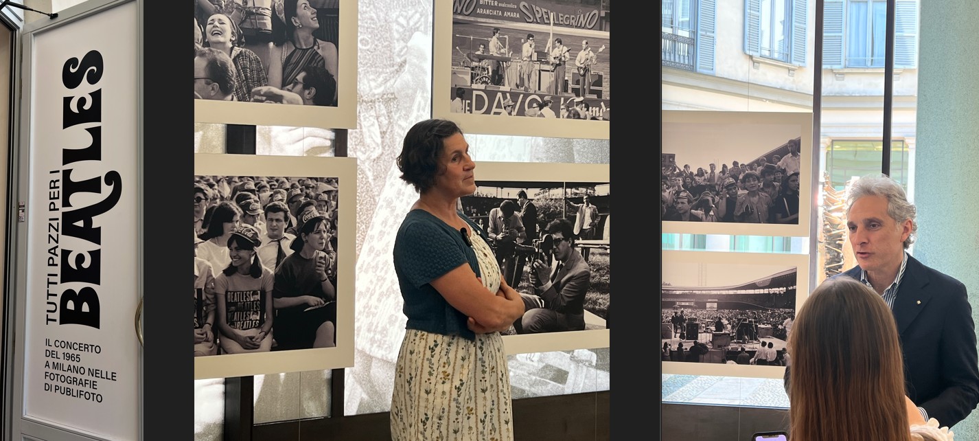 L’Archivio Publifoto, acquistato nel 2015 da Intesa Sanpaolo per valorizzarlo in quanto bene culturale nazionale, si conferma una fonte preziosa per ripercorrere la storia del Novecento italiano. La curatrice della mostra, Barbara Costa, responsabile dell’Archivio Storico Intesa Sanpaolo, ci ha detto: “L’occasione è l’anniversario che dal punto di vista comunicativo è forte. Il doppio concerto a Milano, unico passaggio della loro storia, fu documentato da 7 fotografi di Publifoto, agenzia storia attiva in Italia dagli anni 30 ai 90 del Novecento. L’agenzia fotogiornalistica aveva una funzione commerciale e qui in mostra ci sono sicuramente molte foto inedite. Anche se oggi non sappiamo con esatezza cosa veniva pubblicato dove. Mi sono letta tutte le cronache dell’epoca, sicuramente in Italia il fenomeno non ebbe la portata degli altri paesi. Il concerto del pomeriggio non era sold out. Ci fu uno schieramento di polizia abnorme per timore di disordine. Credo che questi fenomeni siano stati sempre recepiti in Italia con ritardo. Ma credo che uno sguardo attento su queste foto, sui particolari dell’abbigliamento e delle abitudini dei ragazzi può essere una chiave di lettura importante su cosa stesse succedendo in Italia in quegli anni”.