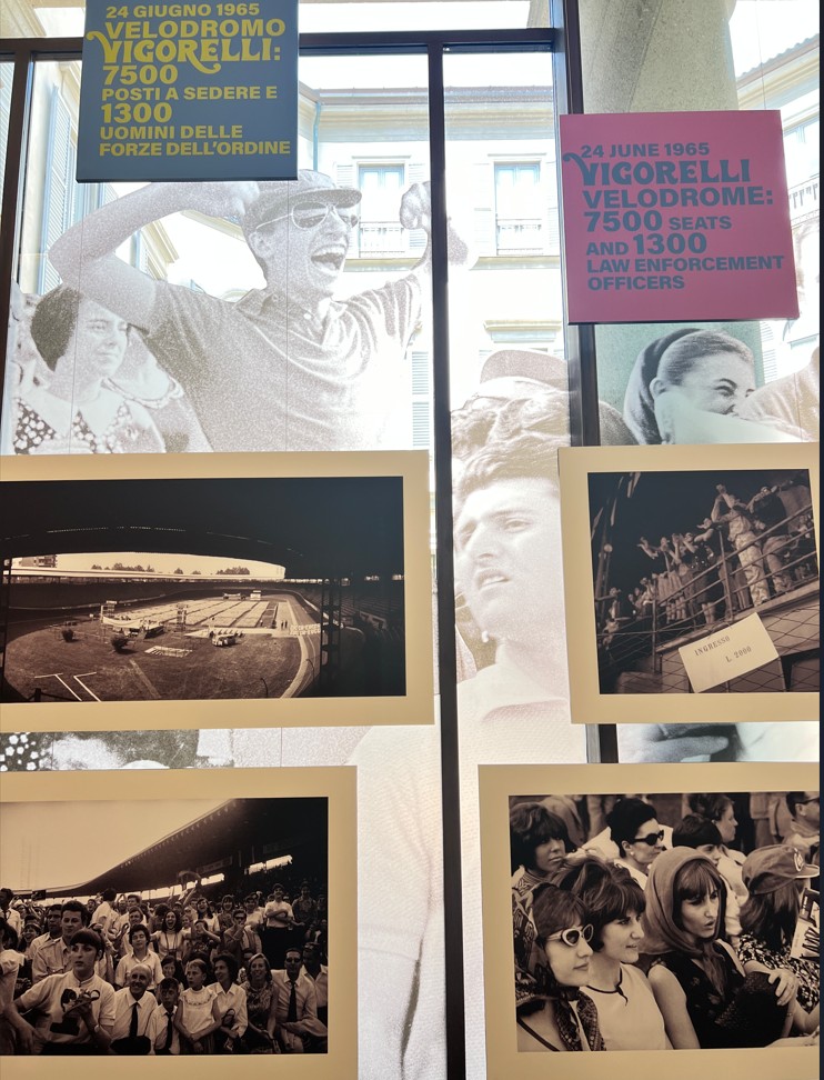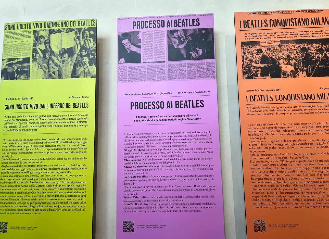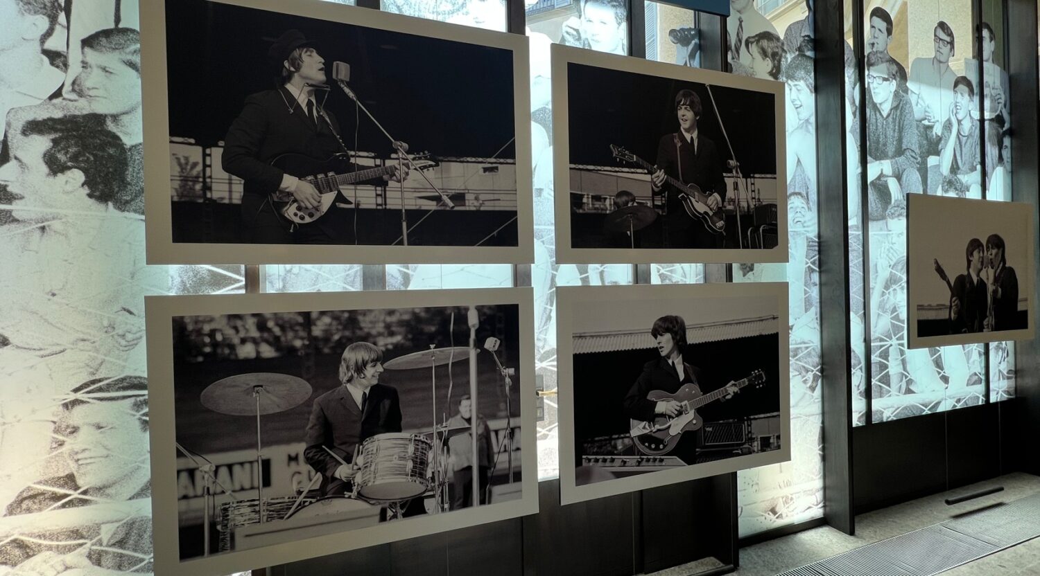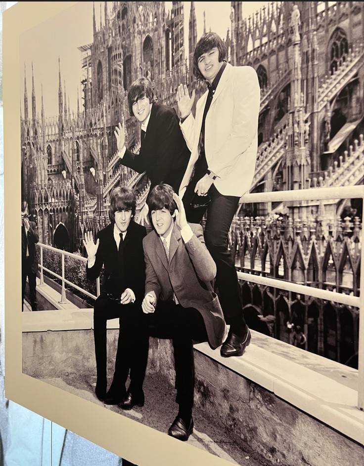 L’Archivio Publifoto, acquistato nel 2015 da Intesa Sanpaolo per valorizzarlo in quanto bene culturale nazionale, si conferma una fonte preziosa per ripercorrere la storia del Novecento italiano. La curatrice della mostra, Barbara Costa, responsabile dell’Archivio Storico Intesa Sanpaolo, ci ha detto: “L’occasione è l’anniversario che dal punto di vista comunicativo è forte. Il doppio concerto a Milano, unico passaggio della loro storia, fu documentato da 7 fotografi di Publifoto, agenzia storia attiva in Italia dagli anni 30 ai 90 del Novecento. L’agenzia fotogiornalistica aveva una funzione commerciale e qui in mostra ci sono sicuramente molte foto inedite. Anche se oggi non sappiamo con esatezza cosa veniva pubblicato dove. Mi sono letta tutte le cronache dell’epoca, sicuramente in Italia il fenomeno non ebbe la portata degli altri paesi. Il concerto del pomeriggio non era sold out. Ci fu uno schieramento di polizia abnorme per timore di disordine. Credo che questi fenomeni siano stati sempre recepiti in Italia con ritardo. Ma credo che uno sguardo attento su queste foto, sui particolari dell’abbigliamento e delle abitudini dei ragazzi può essere una chiave di lettura importante su cosa stesse succedendo in Italia in quegli anni”.