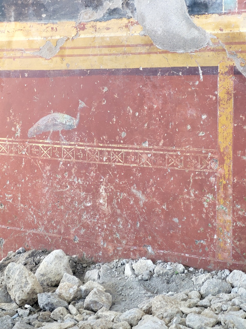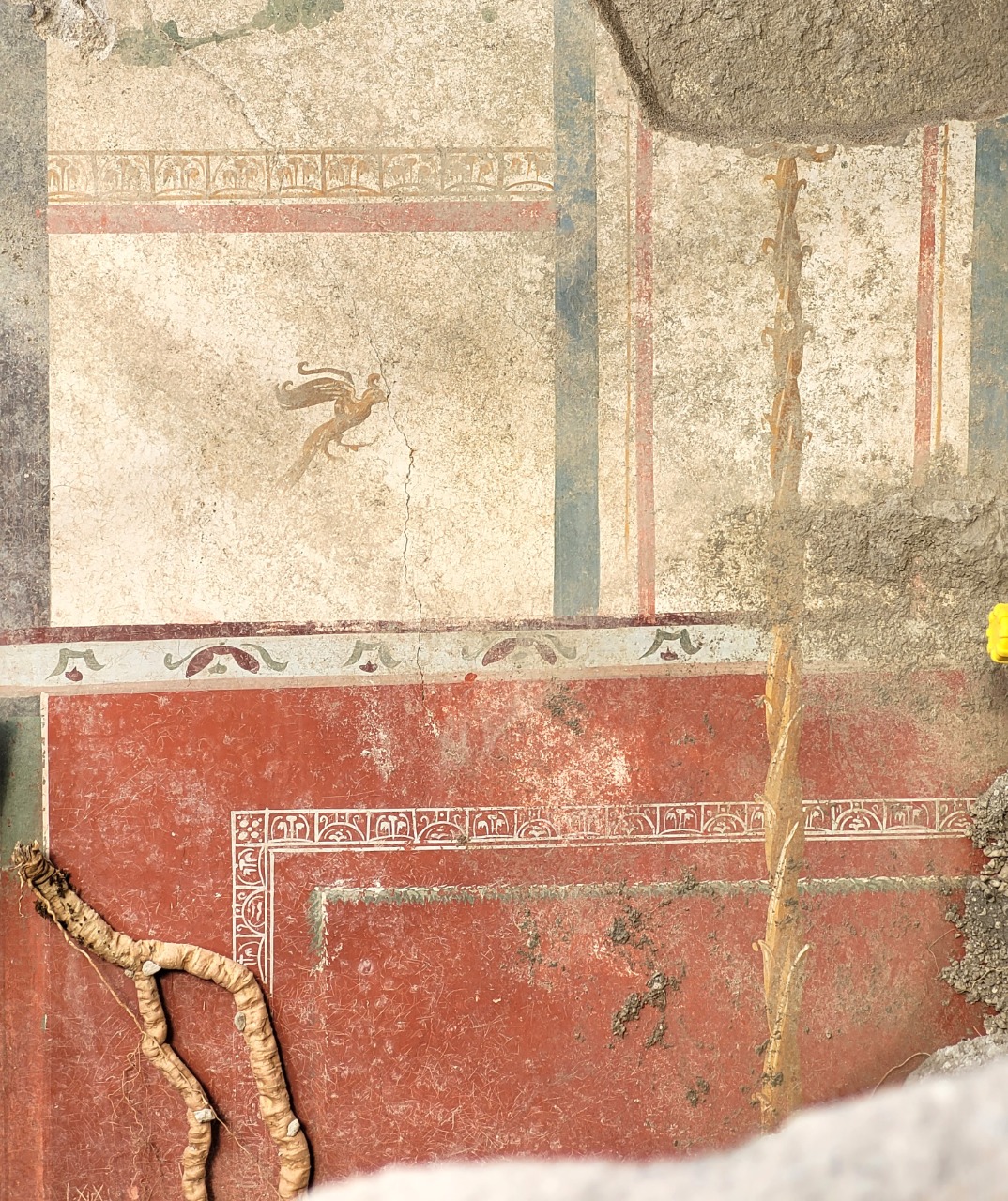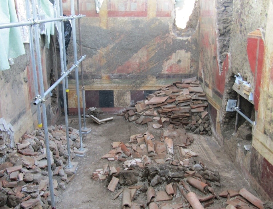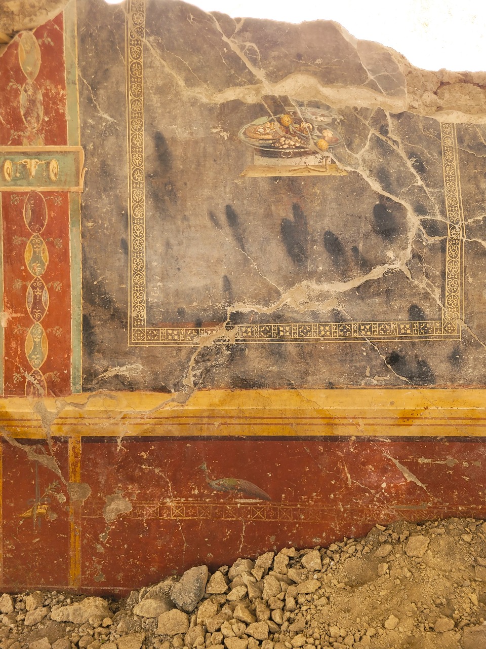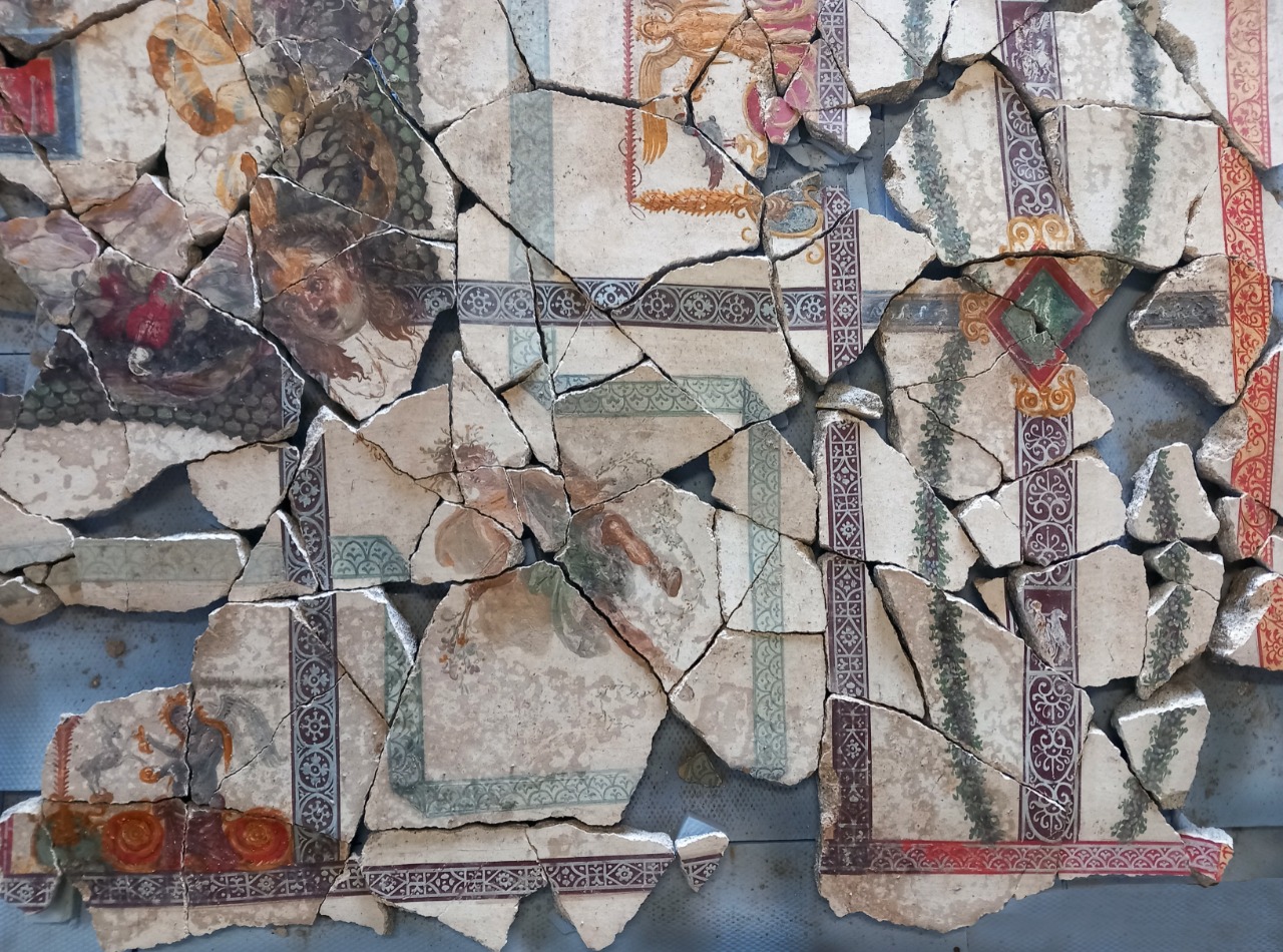 Le scoperte emerse dalla pomice includono gli scheletri di tre vittime, una panetteria (con la famosa “pizza), una lavanderia e notevoli affreschi, tra cui quello di una pizza ante litteram, strumenti e piastrelle, prove di un antico cantiere, notevoli rilievi di serpenti sopra un santuario, e anche le tracce dei sopravvissuti al disastro.