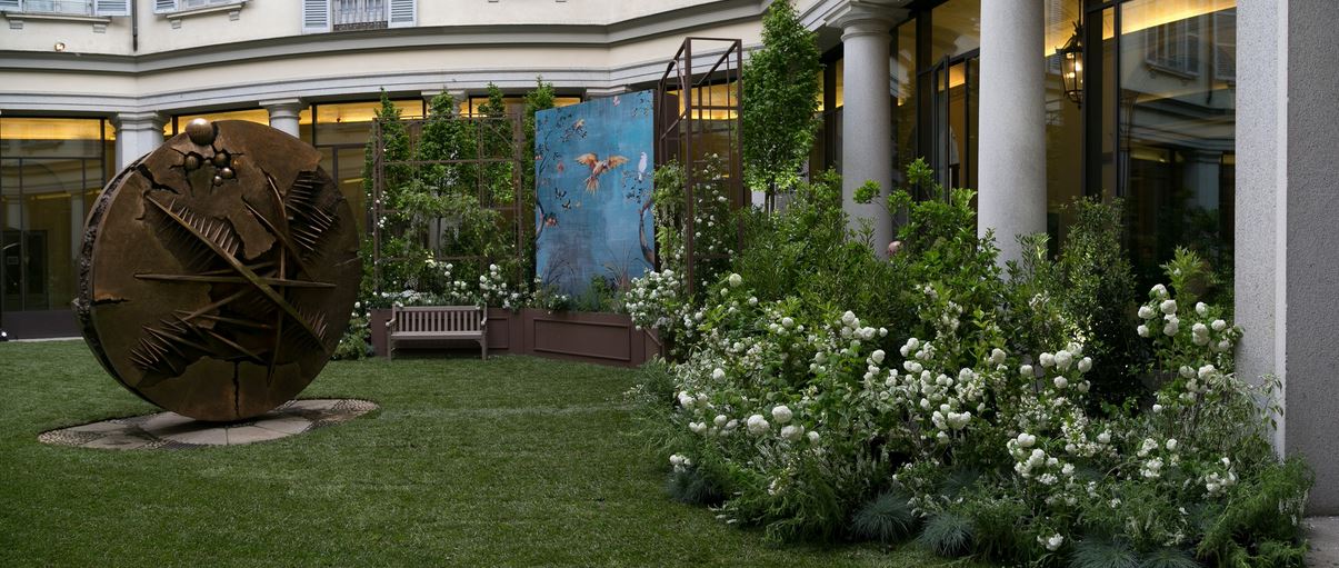 Nel chiostro delle Gallerie d’Italia la scultura Disco in forma di rosa del deserto, di Arnaldo Pomodoro, punto focale del layout