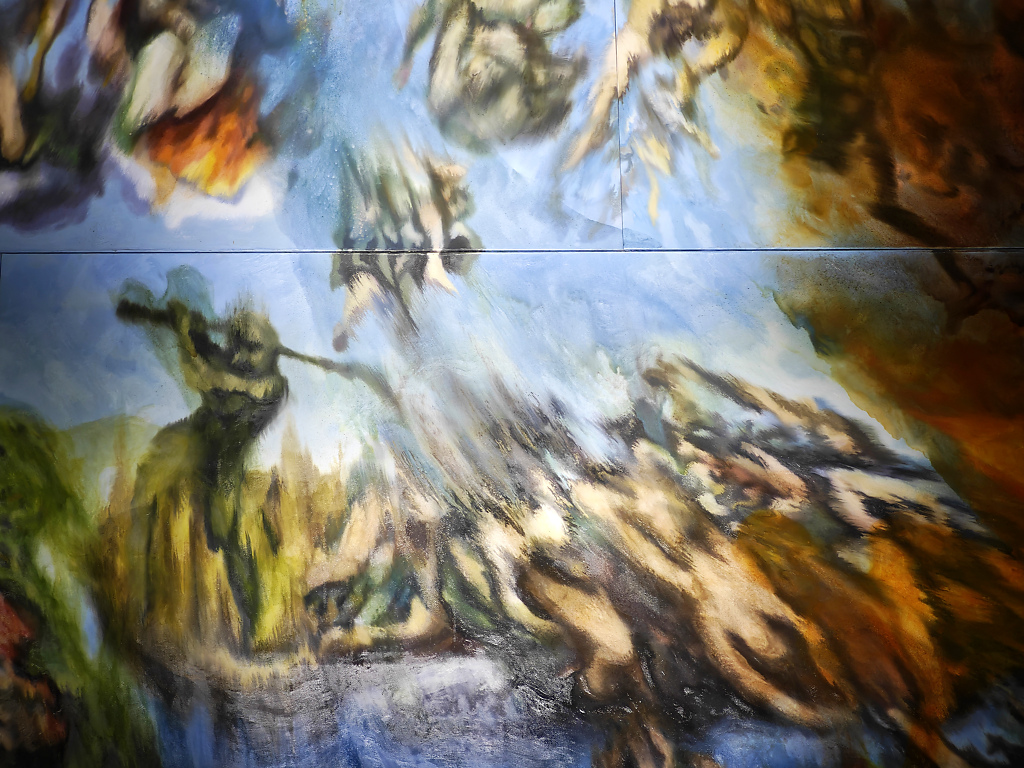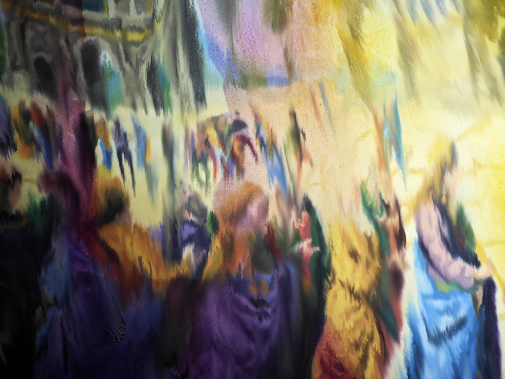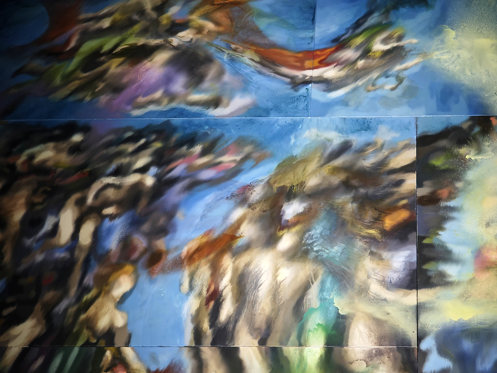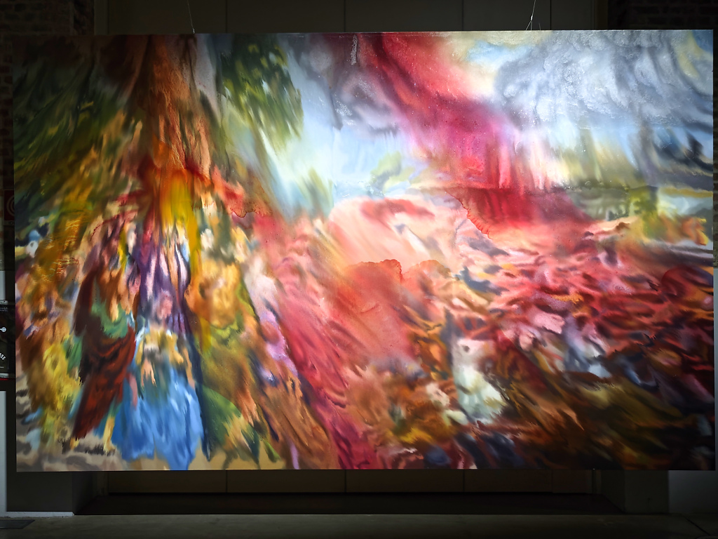 Il risultato è un’opera monumentale di 180 mq, osservabile dall’alto, che travolge lo spettatore in un “tsunami cromatico”: dissolvenze, colori in movimento, assenza di contorni netti. La pittura si espande, si svuota, si fa metafora del nostro tempo fluido, complesso, incerto.