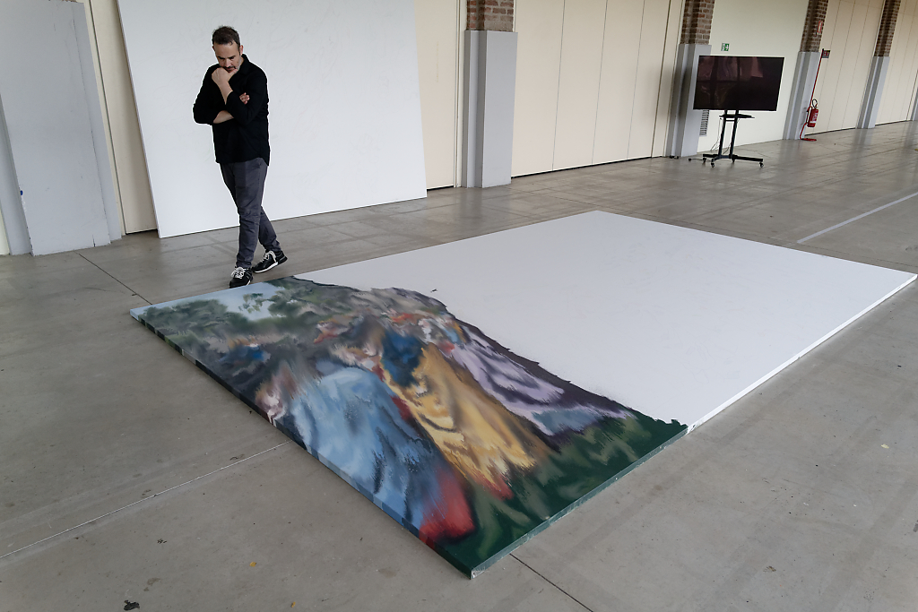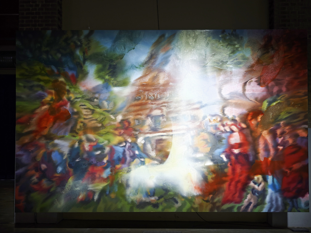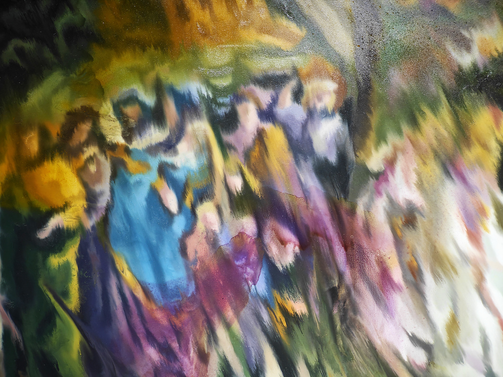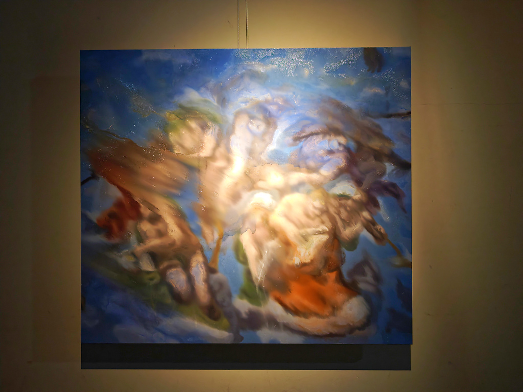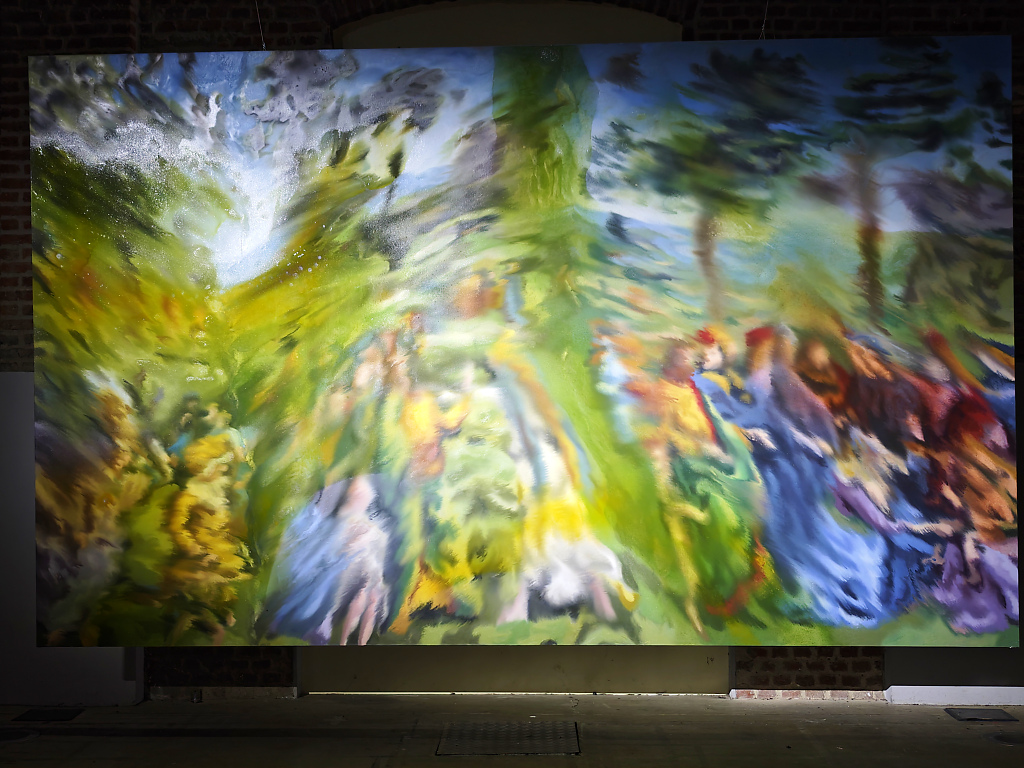 Il risultato è un’opera monumentale di 180 mq, osservabile dall’alto, che travolge lo spettatore in un “tsunami cromatico”: dissolvenze, colori in movimento, assenza di contorni netti. La pittura si espande, si svuota, si fa metafora del nostro tempo fluido, complesso, incerto.