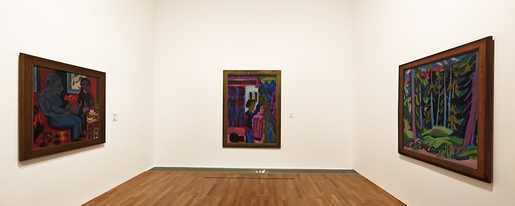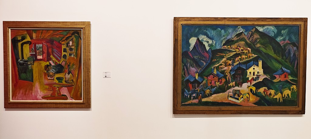 Il ritmo dell’incontaminata vita rurale sulla Stafelalp è riportato, in mostra, in Alpaufzug (Salita all’alpe), uno dei primi dipinti di Kirchner di grande formato a soggetto alpino. In altre opere il paesaggio montano diventa invece sinonimo figurato della violenta lotta interiore dell’artista, quel continuo alternarsi di pace e angoscia che lo accompagnerà per tutta l’esistenza.