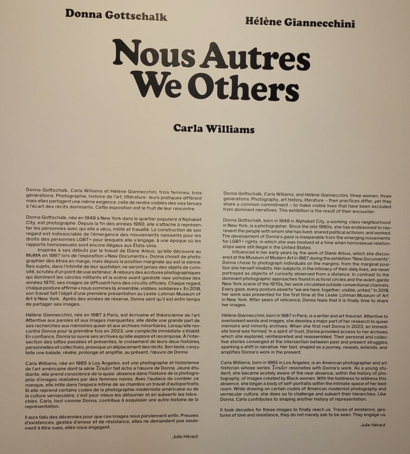 Per dare contesto storico, basti pensare che i moti di Stonewall, che sono le rivolte a cui ogni anno si rifà il Gay Pride nel mondo, sono datati 1969. L’omosessualità in America non era vietata in tutti gli stati, ma negli anni 70 c’erano ancora delle proibizioni sparse negli Stati Uniti. LE BAL di Parigi presenta, per la prima volta in Francia, il lavoro di Donna Gottschalk, Carla Williams e Hélène Giannecchini, tre donne, tre generazioni. Fotografia, storia dell’arte, letteratura: le loro pratiche sono diverse, ma condividono un impegno comune: rendere visibili vite escluse dalle narrazioni dominanti. Questa mostra è il risultato del loro incontro.
