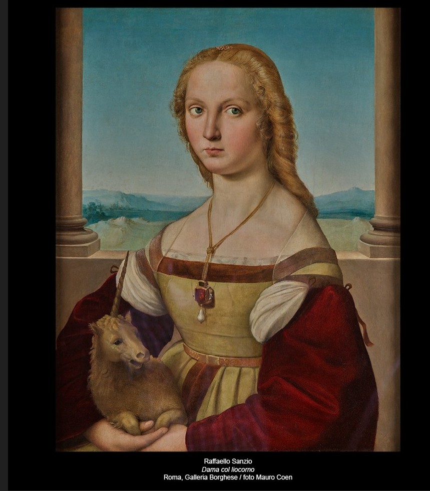 In foto di apertura: Raffaello Sanzio, Dama col liocorno, inizio del 1505, olio su tavola trasportata su tela (applicata su tavola), 67 x 56 cm. Roma, Galleria Borghese / foto A. Novelli