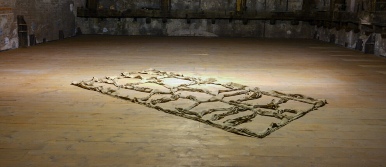 La mostra, dal titolo COTIDIE TRADĔRE, a cura di Ilaria Bignotti, Beatrice Cuccirelli e Camilla Remondina, si apre nel piano ammezzato con Ron Ron, un’opera storica datata 1972 e composta da un gomitolo di tessuto ed ecopelliccia, una presenza quieta che stimola nel visitatore la sensazione di trovarsi in un ambiente domestico, e con un grande Alveare, una griglia soffice e chiara del 2017, un ulteriore rimando iconico alla casa e alla città, al luogo operoso dove ciascuno compie il proprio dovere per il bene della comunità.